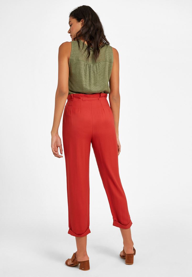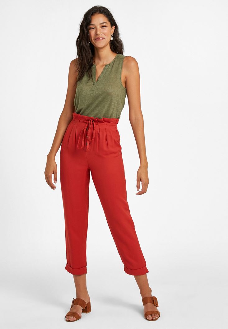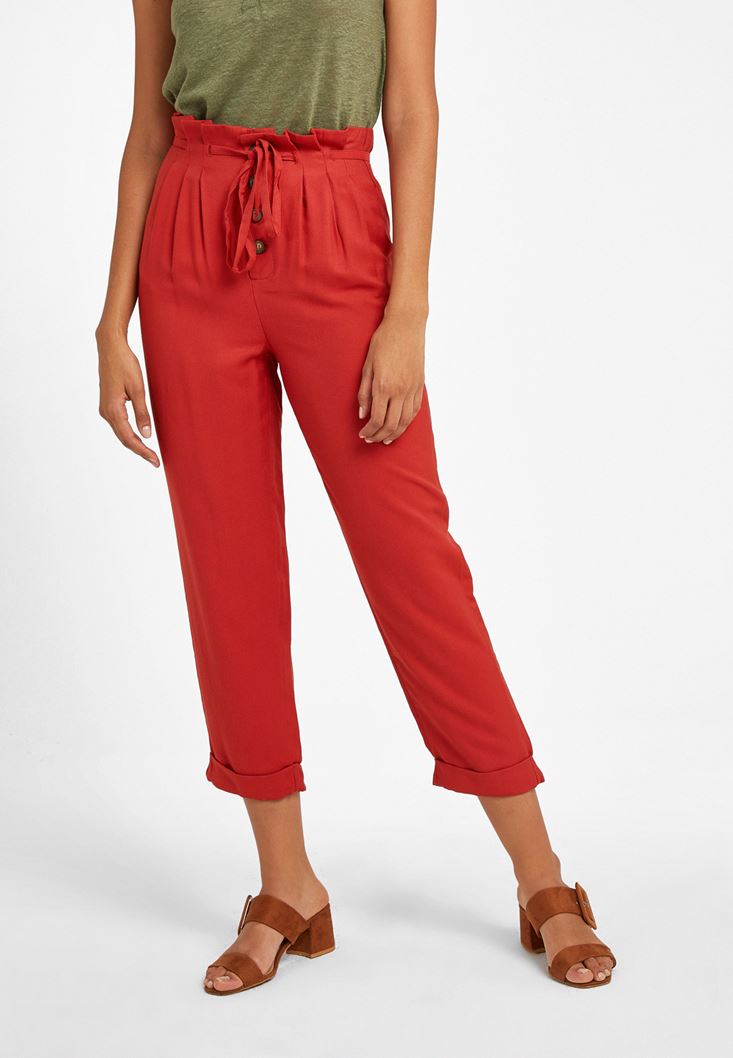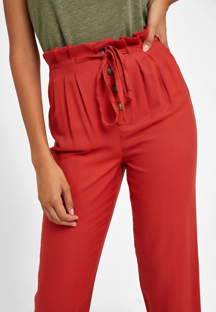 Kırmızı Beli Bağlamalı Düğme Detaylı Pantolon