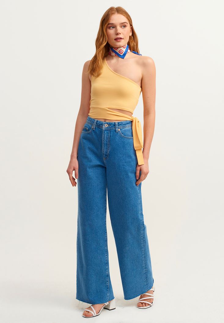 • Bayan Sarı Beli Bağlamalı Tek Omuz Crop Top (MODAL)