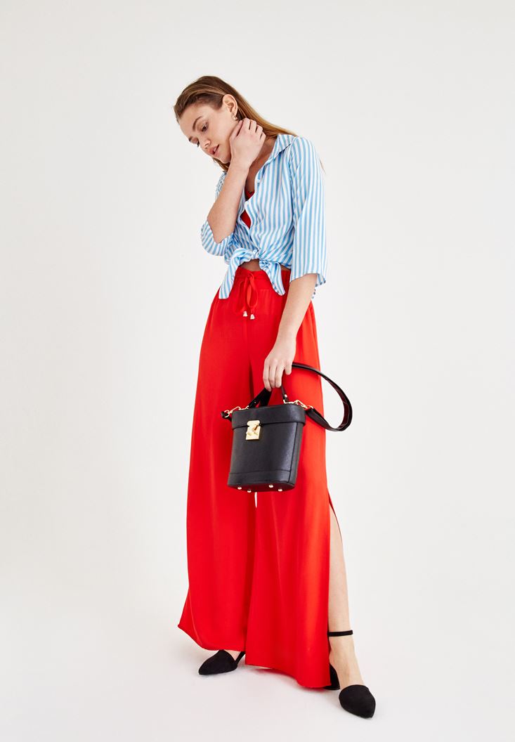 Kırmızı Beli Bağlamalı Yırtmaç Detaylı Pantolon