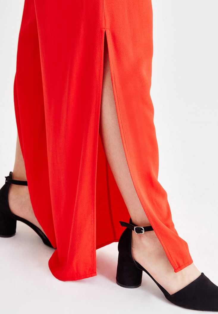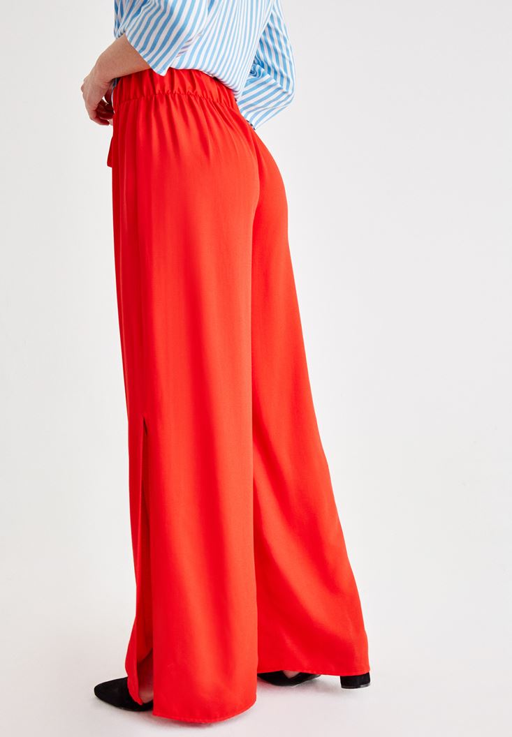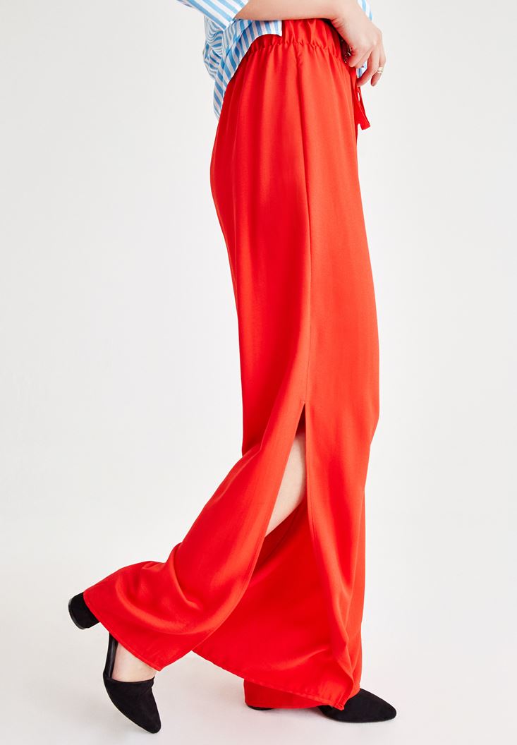 • Bayan Kırmızı Beli Bağlamalı Yırtmaç Detaylı Pantolon
