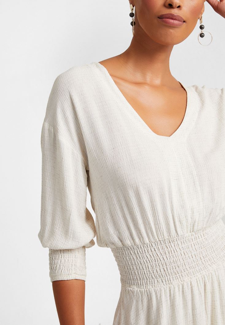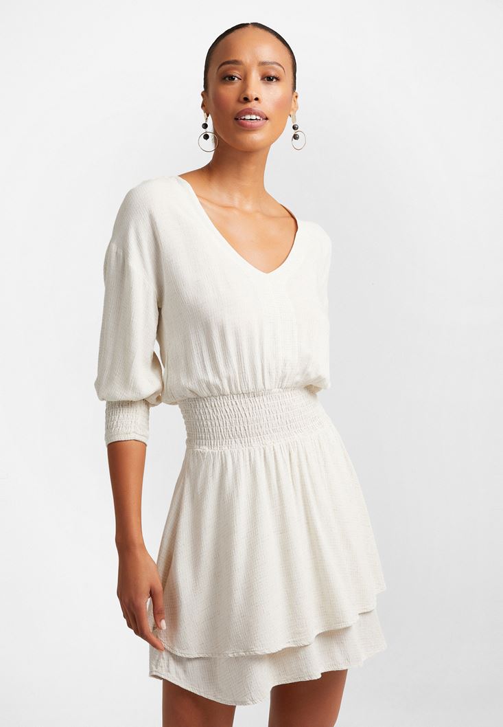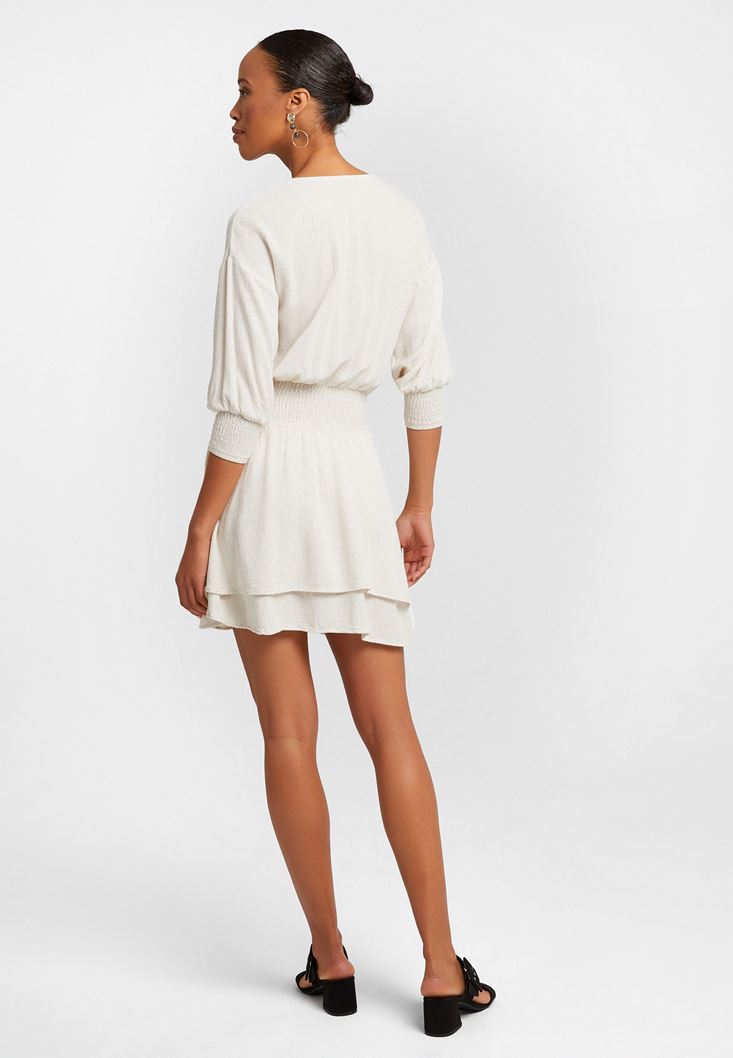 Bej Beli Büzgülü Mini Elbise