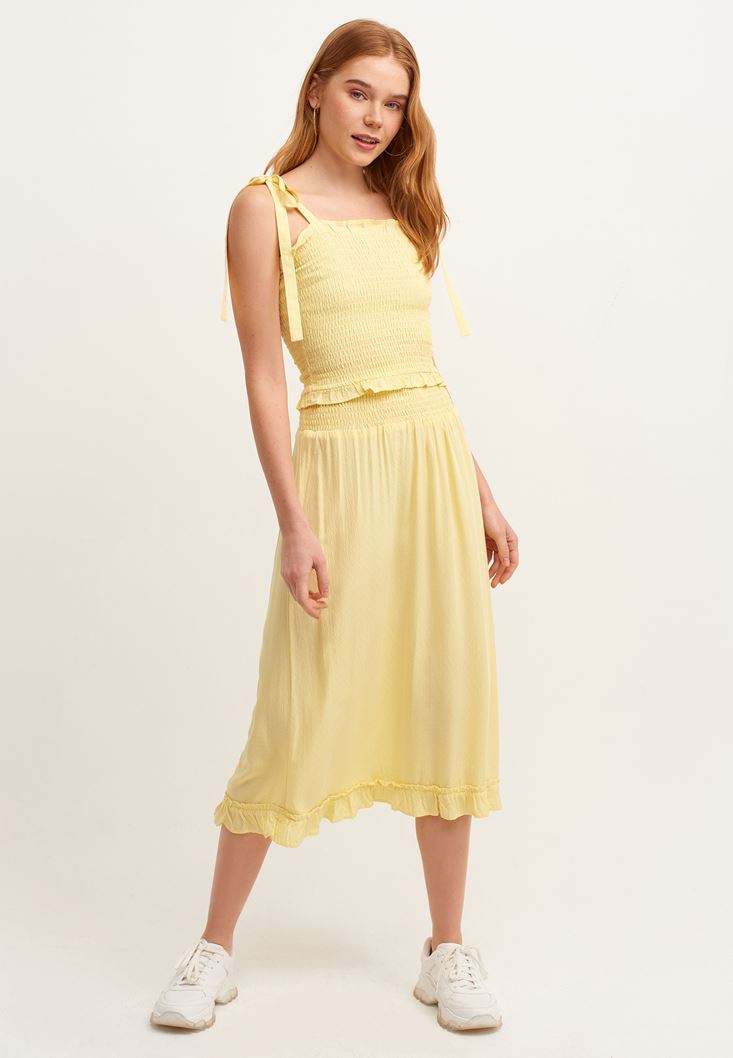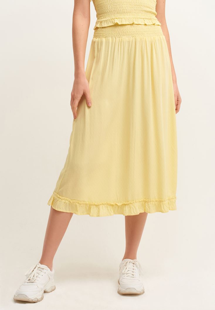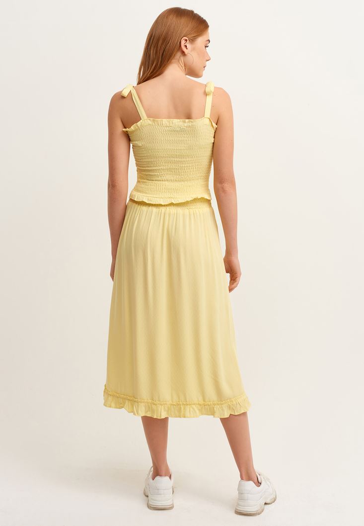 %100 viskon içerikli, beli gipeli, etek ucu fırfırlı, midi boy, yüksek bel, bedenden uzak rahat form.