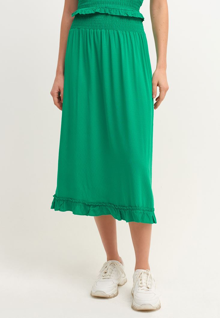 %100 viskon içerikli, beli gipeli, etek ucu fırfırlı, midi boy, yüksek bel, bedenden uzak rahat form.