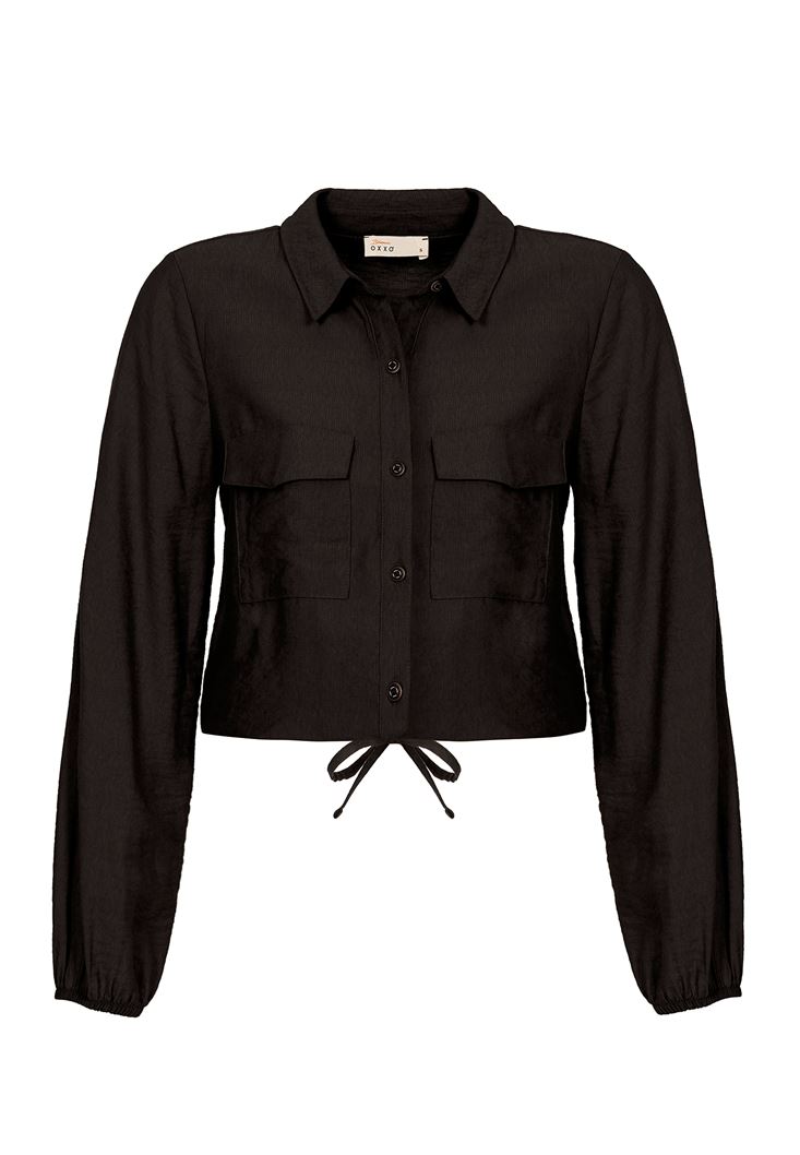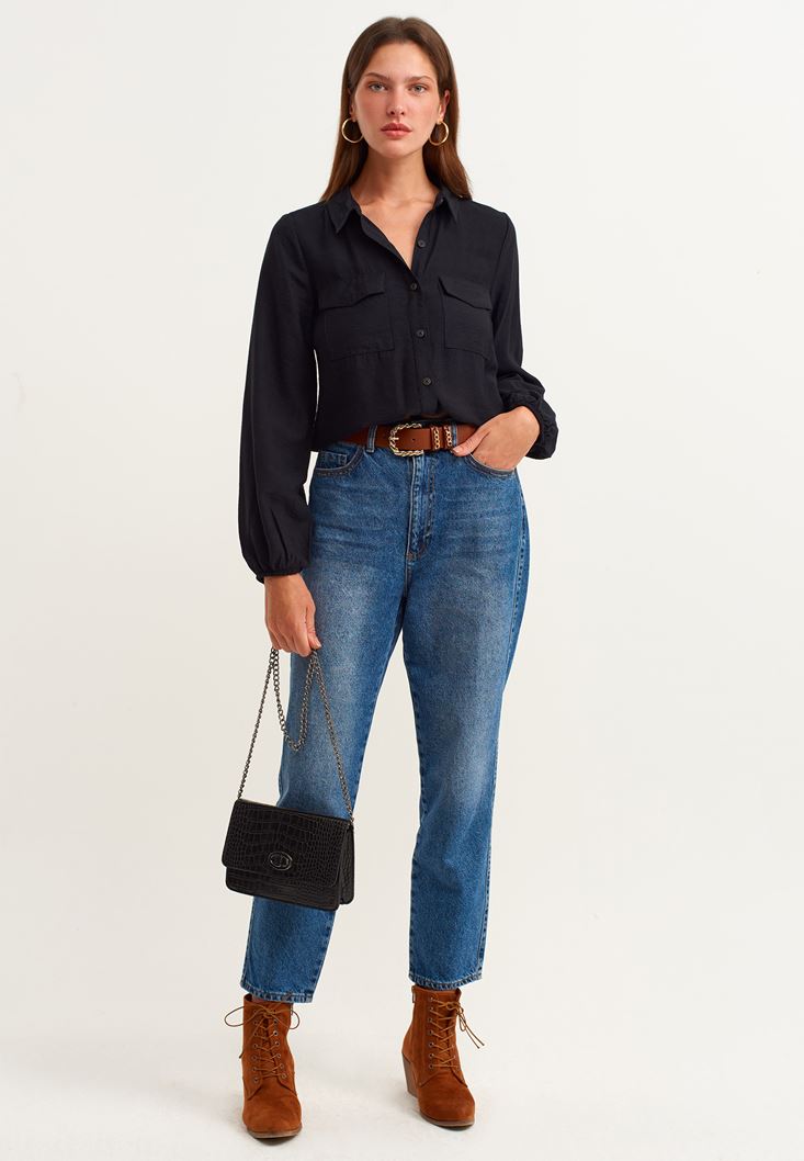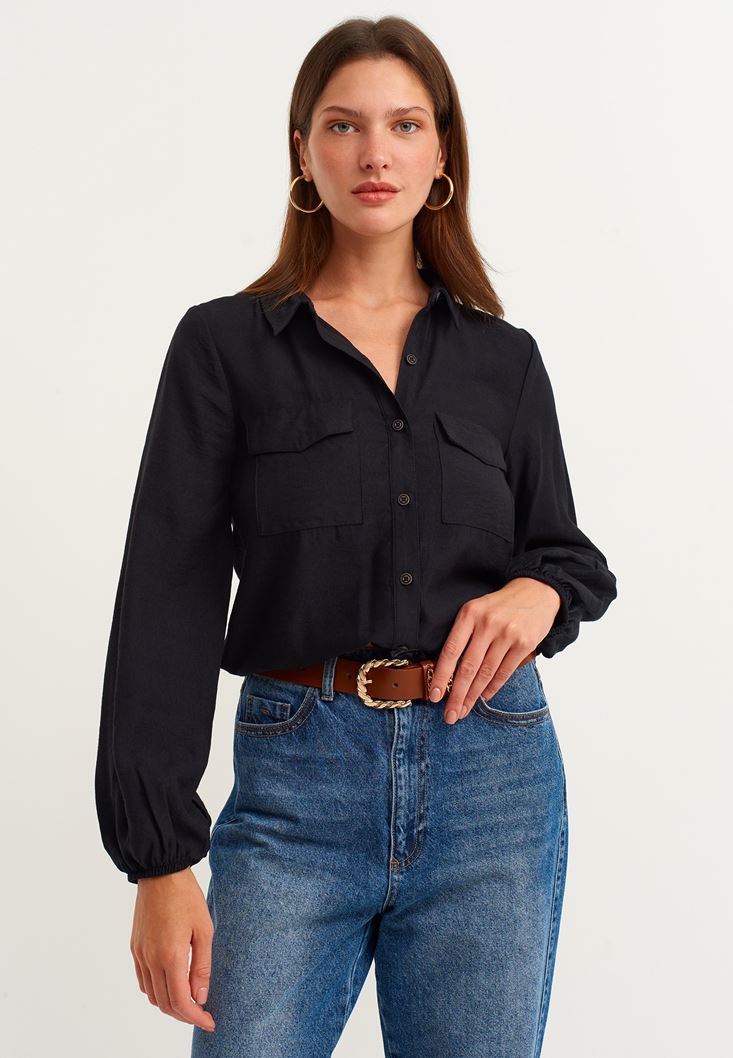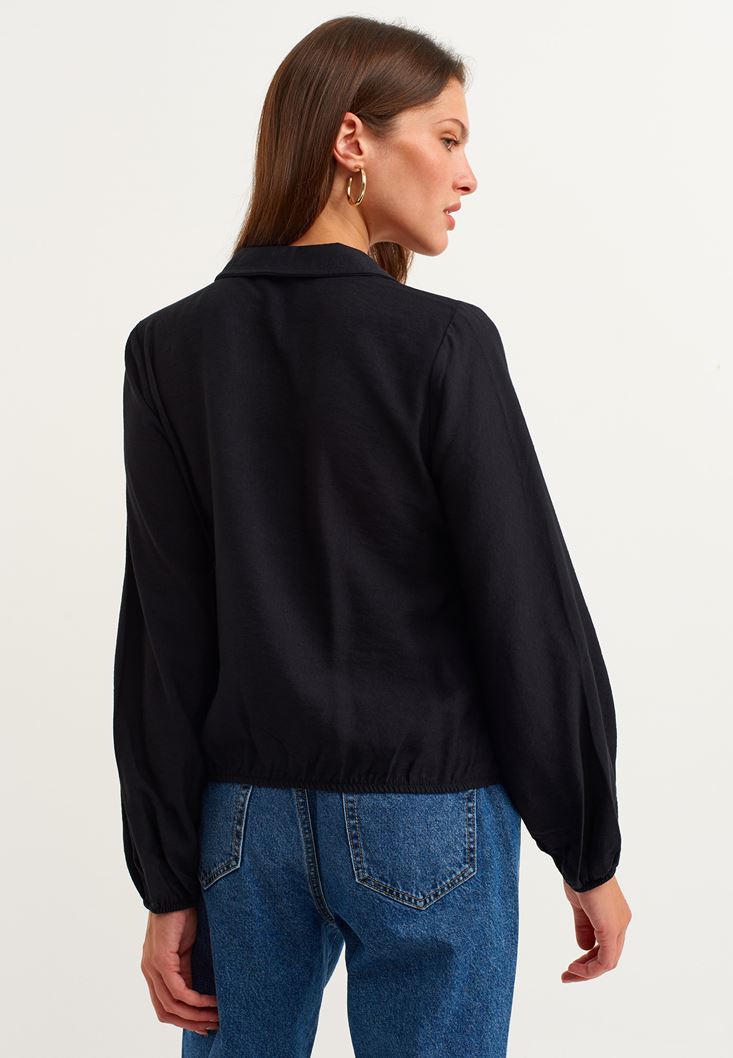 • Bayan Siyah Beli Lastik Detaylı Gömlek