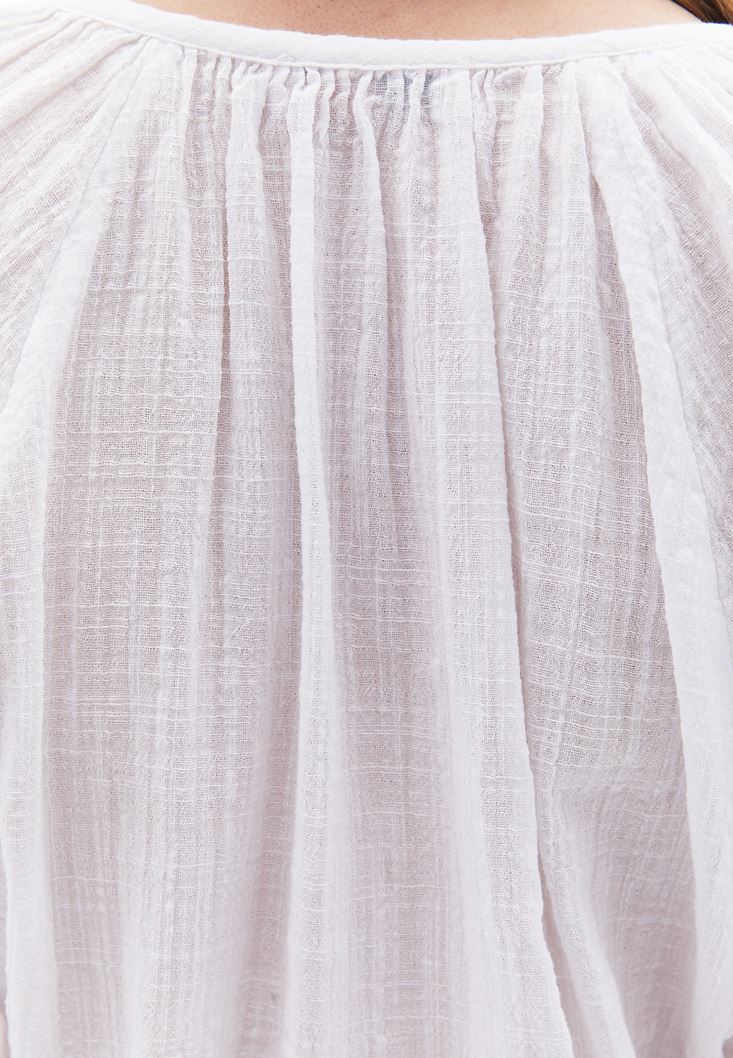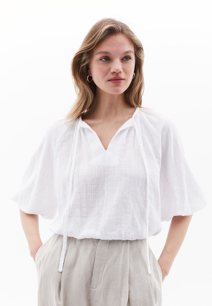 Pamuk ve viskon karışımlı doku, balon kollu, bedenden uzak rahat fit, yakası bağcıklı, yarım kollu, crop kesim.