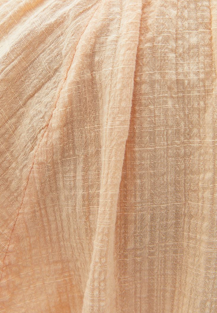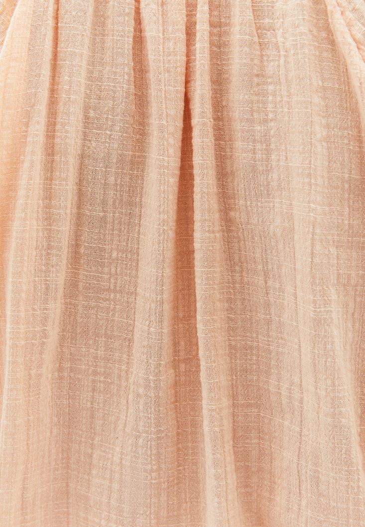 Pamuk ve viskon karışımlı doku, balon kollu, bedenden uzak rahat fit, yakası bağcıklı, yarım kollu, crop kesim.