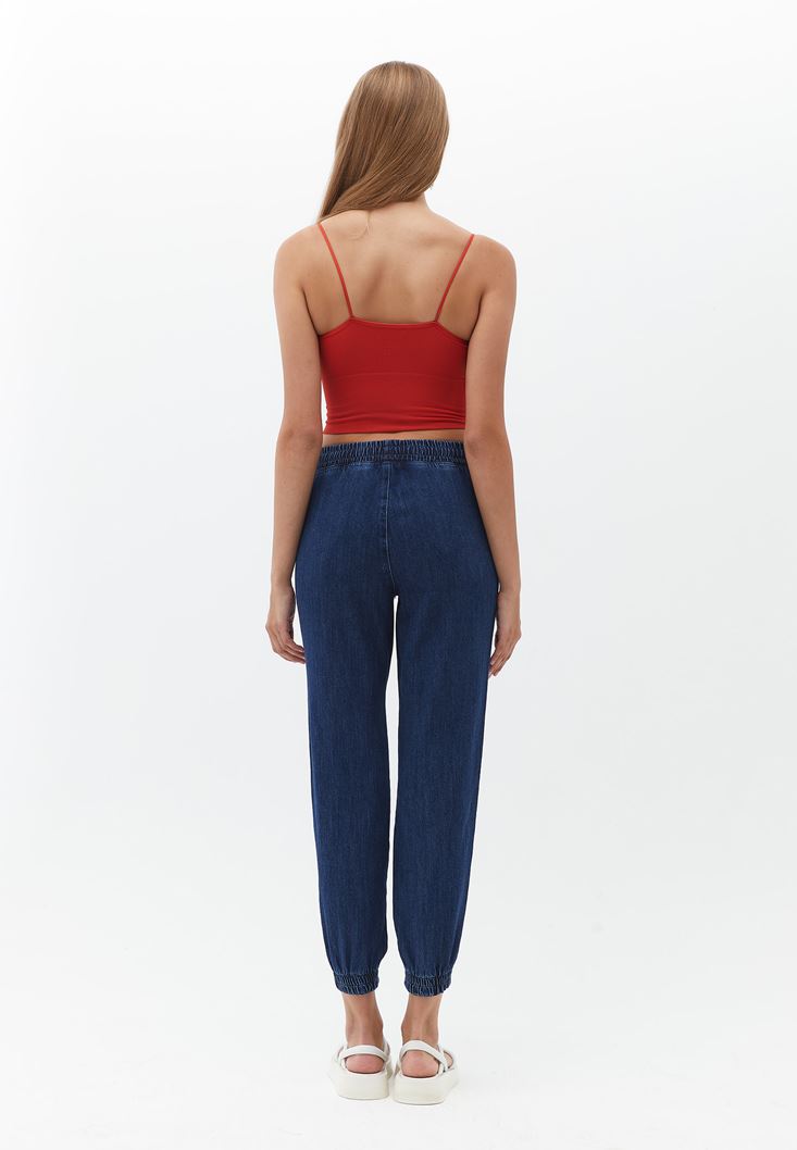 %100 pamuklu denim doku, orta bel, beli ve paçası lastikli, jogger-fit, ön kısmı iki cepli, bedene yakın rahat kalıp, bilekte biten paça boyu.