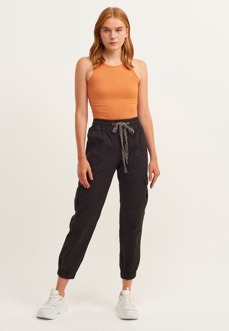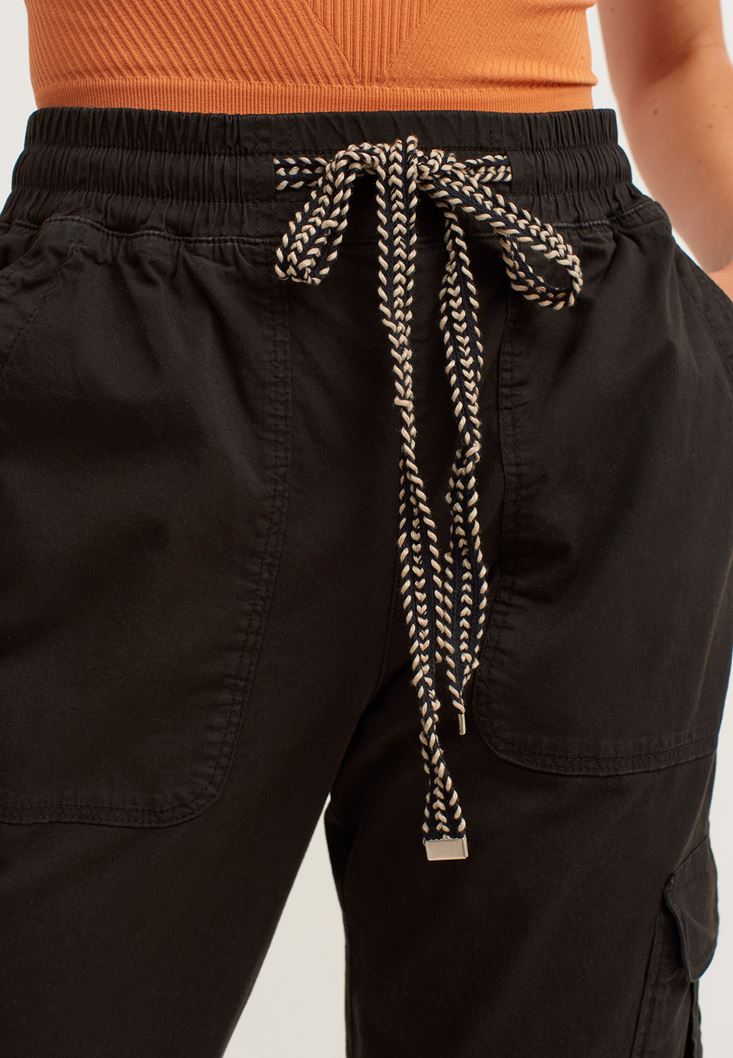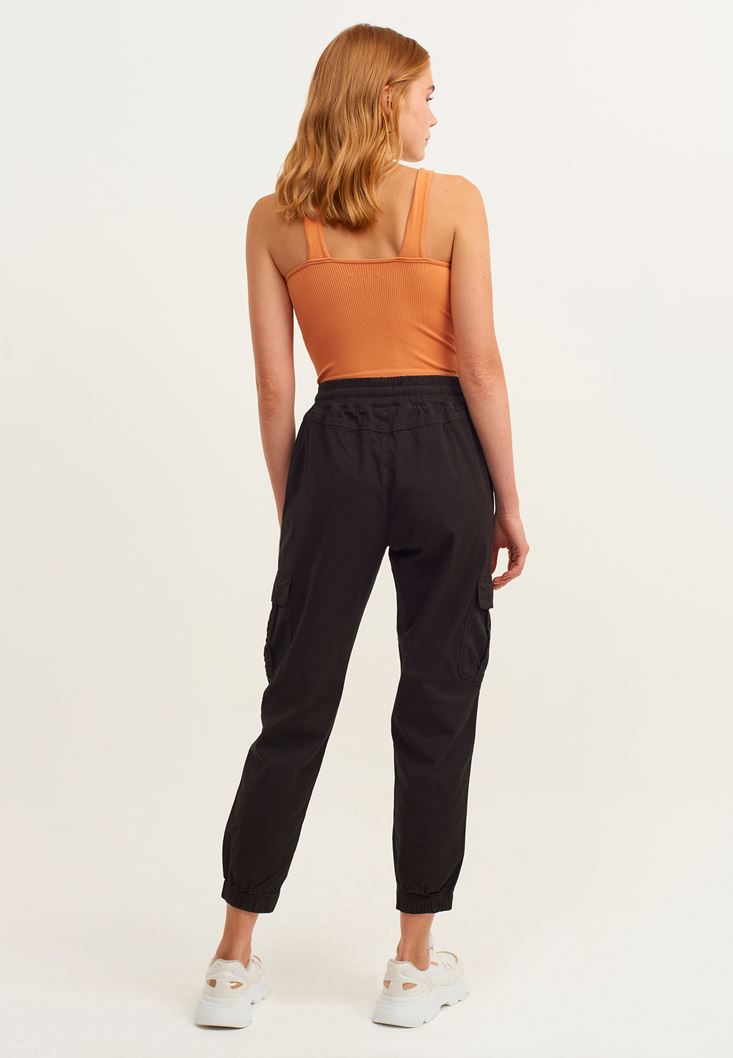 • Bayan Siyah Beli Lastikli Kargo Jogger Pantolon