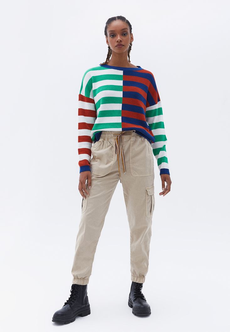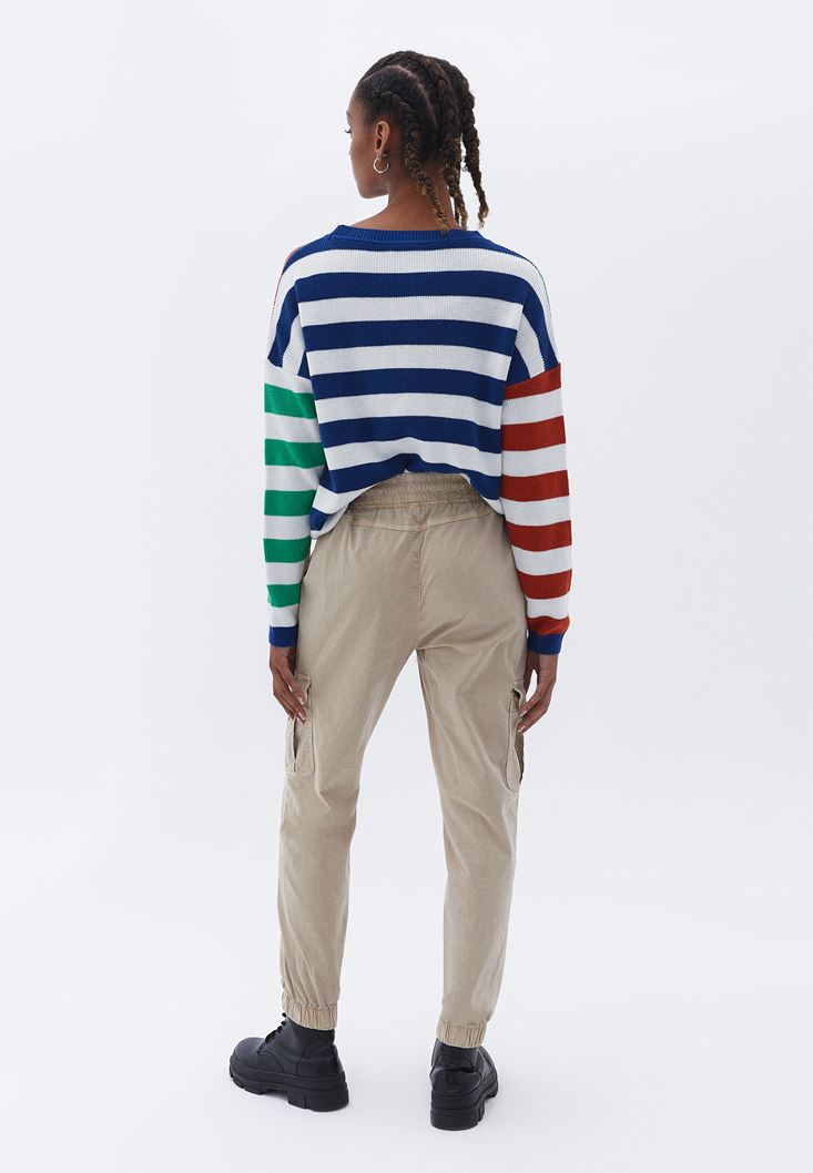 Pamuk içerikli doku, jogger fit, beli ve paçası lastikli, üst ve alt kısmı cep detaylı, beli bağcıklı, yüksek bel.