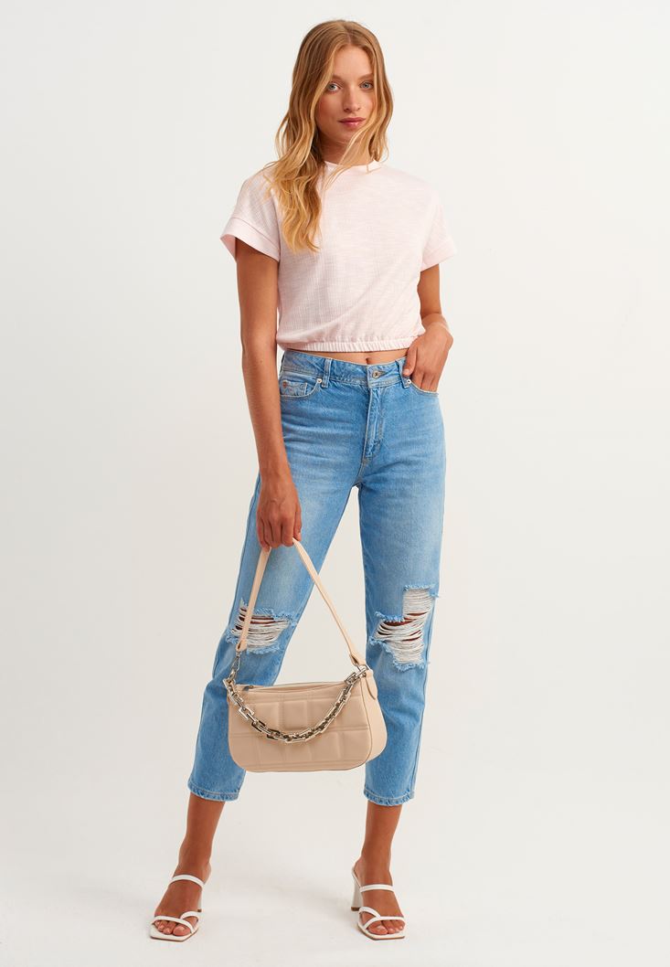 Viskon karışımlı doku, sıfır yaka, beli lastikli, crop kesim, bedene yakın close-fit, kısa kollu.