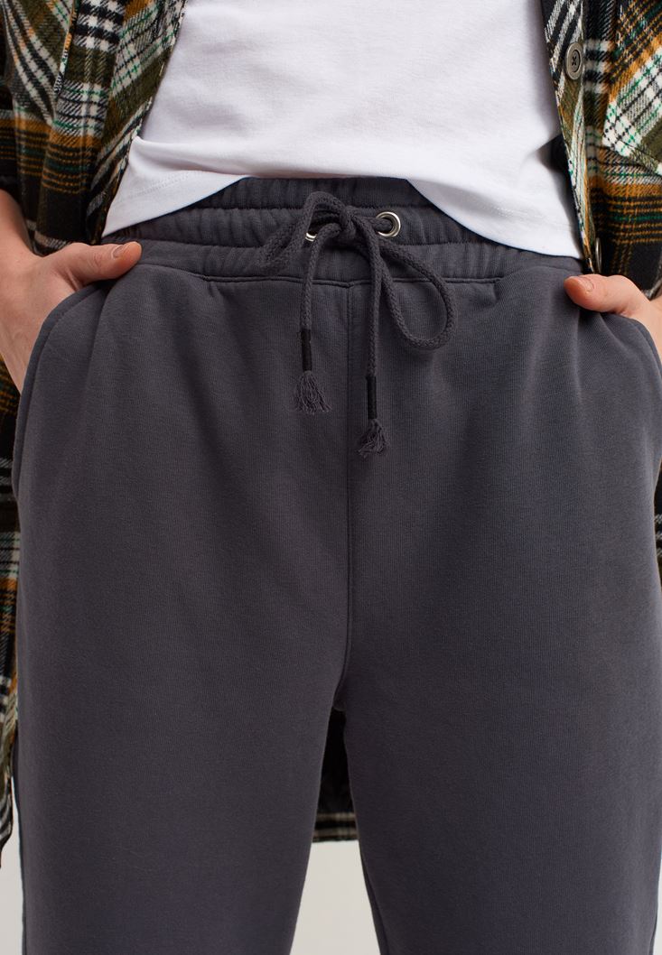 Pamuk karışımlı özel doku, bağcıklı ve büzgülü bel, jogger paça formu, ön kısmında iki cep detayı.