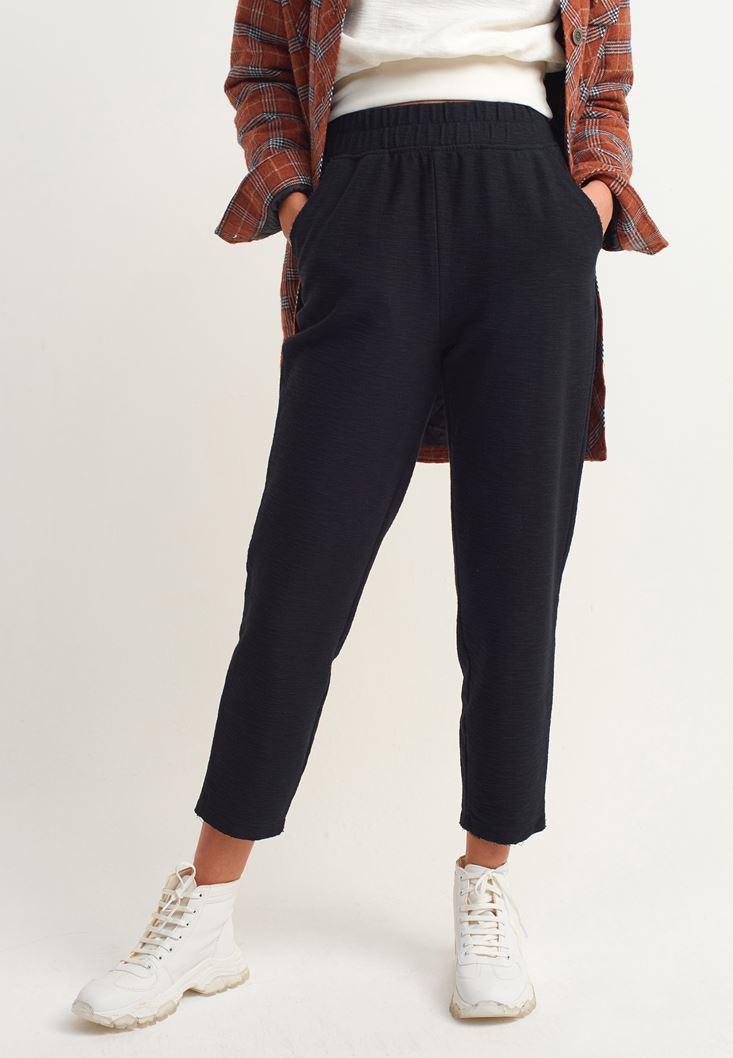 Yüksek pamuk karışımlı doku, kalın lastikli ve konforlu bel, iki cepli, kesik detaylı jogger paça.