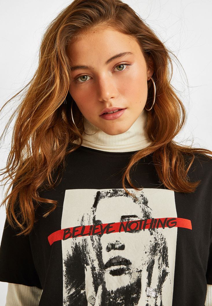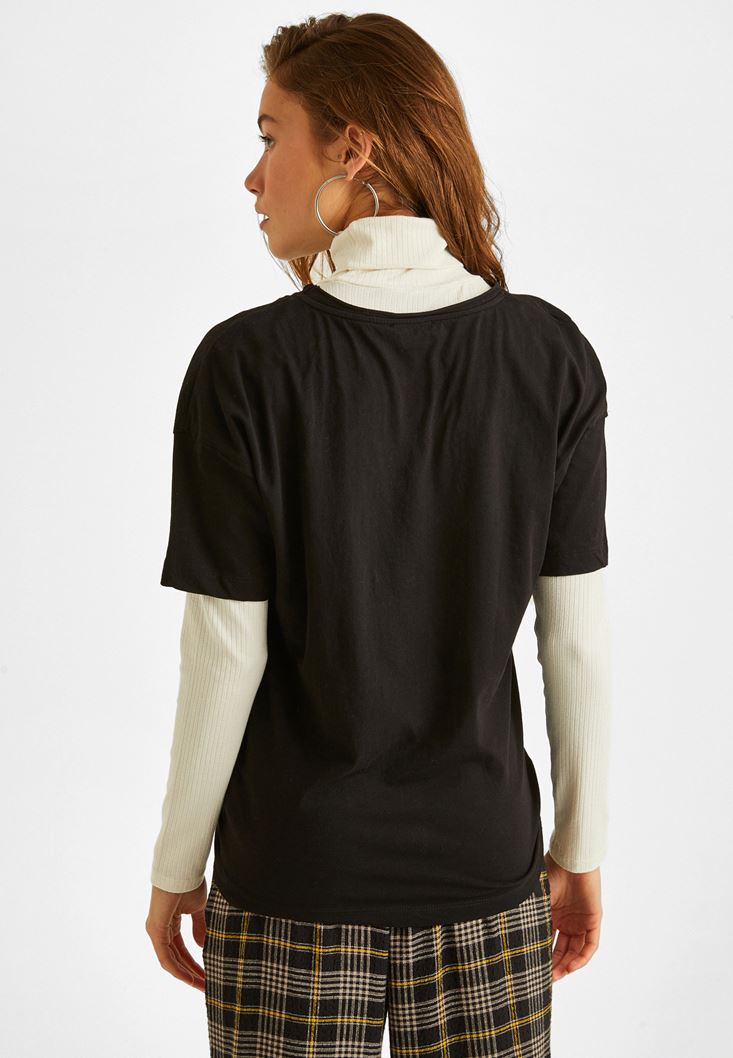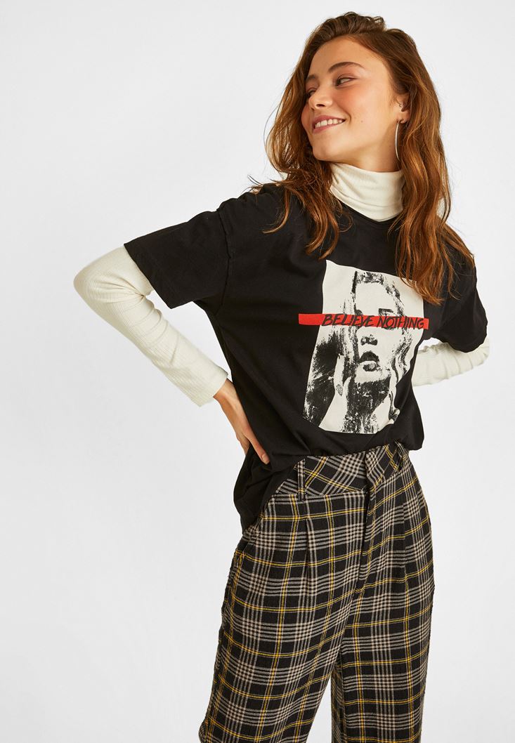 • Bayan Siyah Bisiklet Yaka Baskılı Tişört