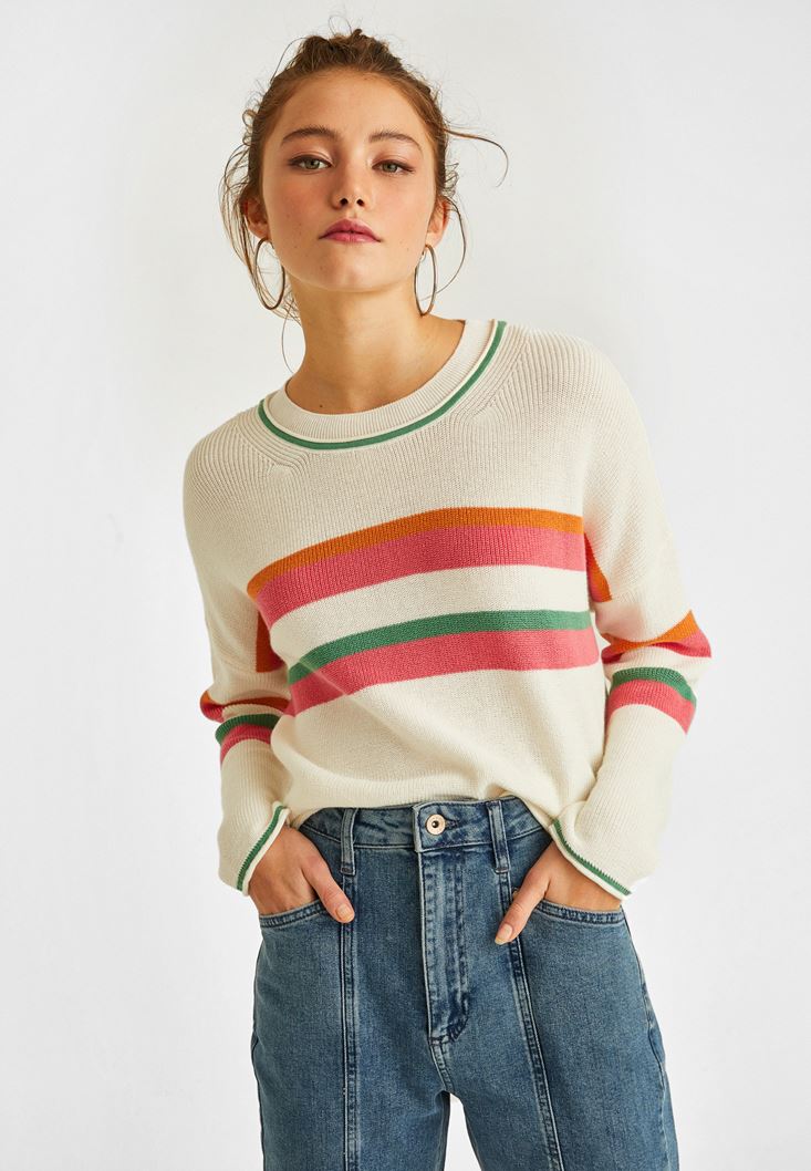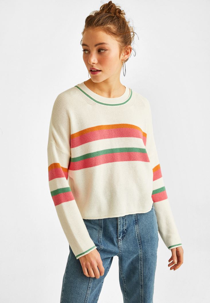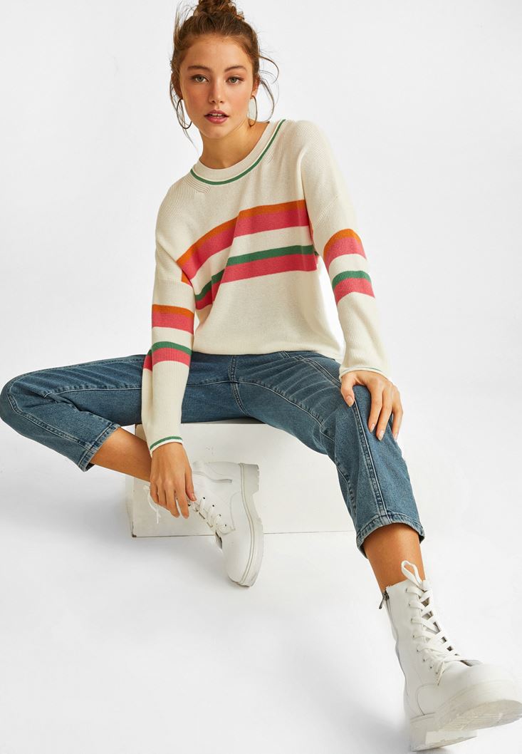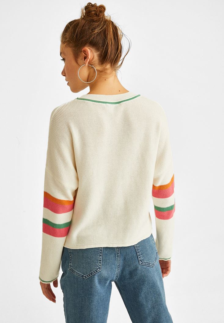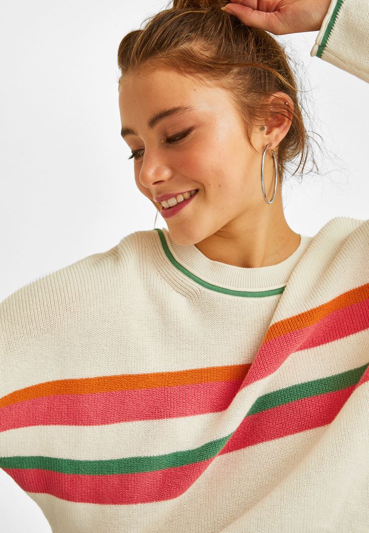 • Bayan Krem Bisiklet Yaka Çizgili Kazak