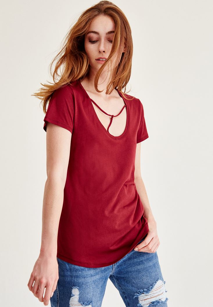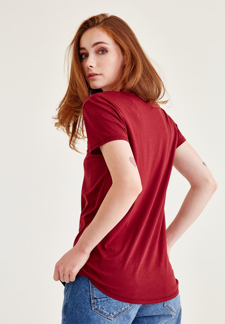 • Bayan Bordo Biye Detaylı Basic Tişört