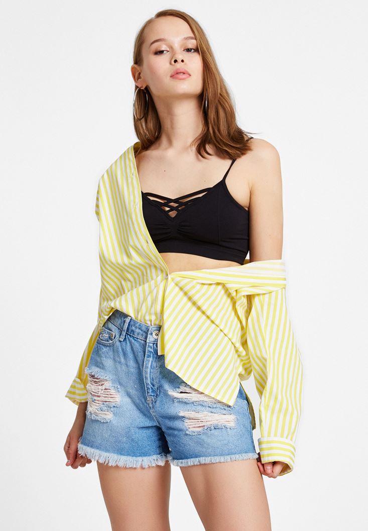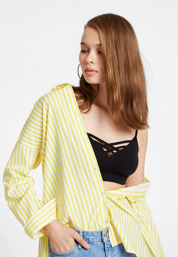 Biye Detayli Büstiyer dokusu ve tasarim detaylari ile oldukça dikkat çekici bir parça olarak ön plana çikiyor. Kiyafetlerinizi tamamlamak için rahatlikla tercih edebileceginiz büstiyer modelinin yumusak dokusu da tasarimin konforlu bir sekilde kullanilmasina olanak sagliyor. Ince askili tasarimin kup üzerinde bulunan çapraz bant geçisleri tasarima hareket kazandiriyor. Dolgusuz kup tasarimi, kup altinda devam eden ve vücudu saran tasarim ile sikliginizi tamamlayacaksiniz.