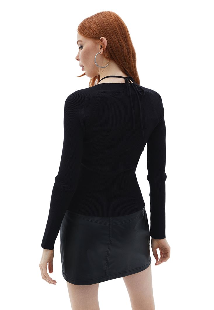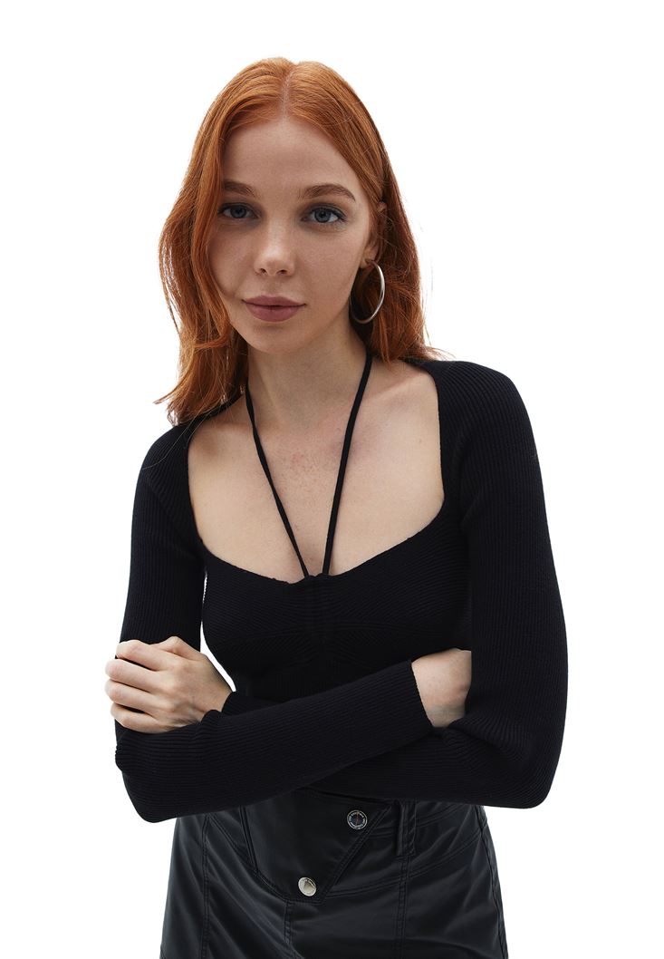 Viskon karışımlı triko, geniş yaka, uzun kollu, boyundan bağlama detaylı, bedeni saran fit.