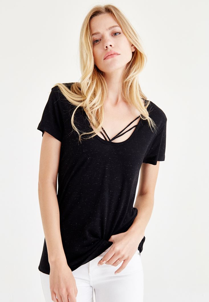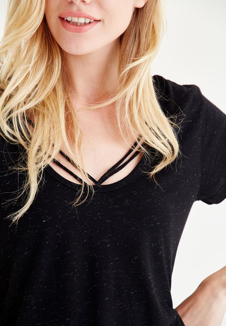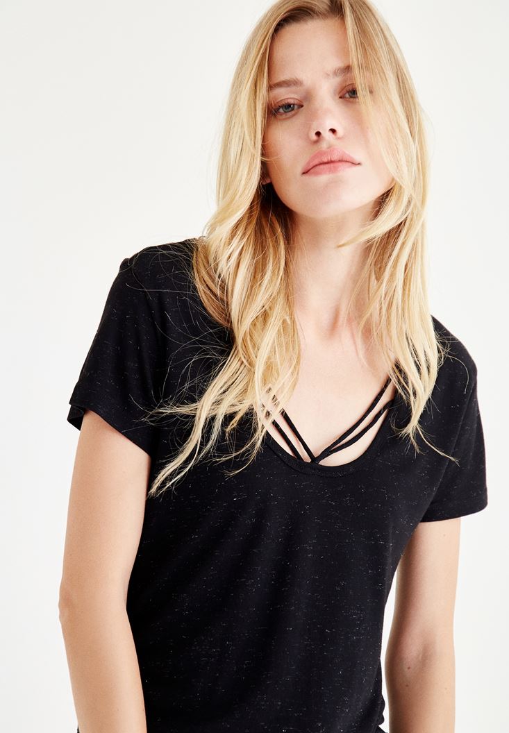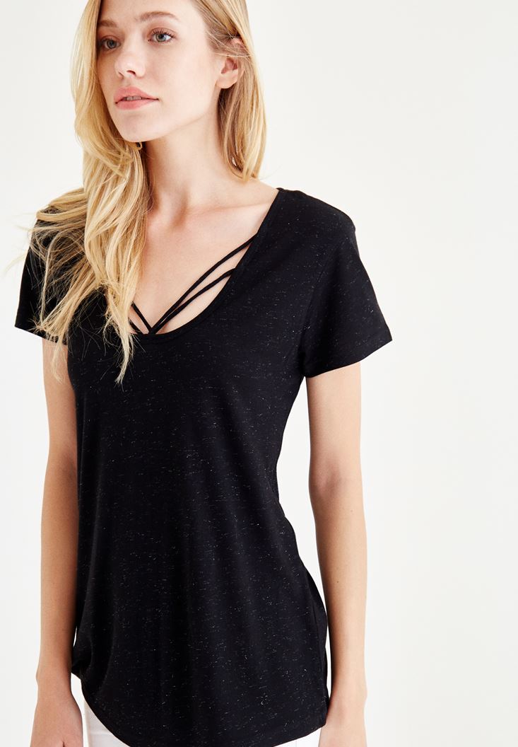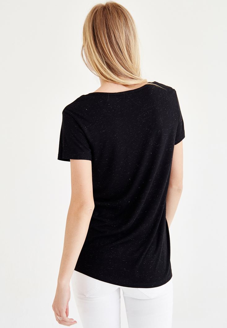 Siyah Biye Detaylı Simli Tişört