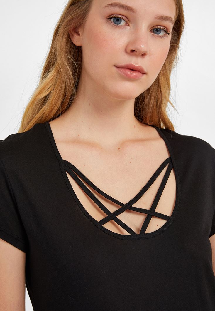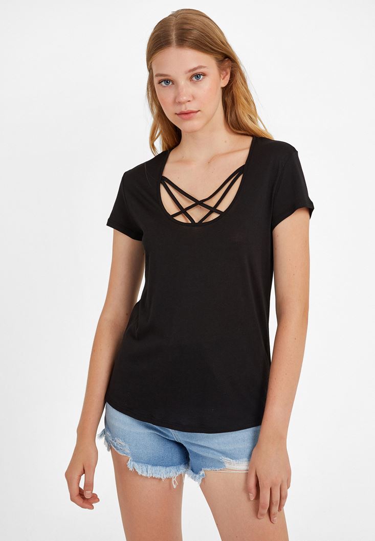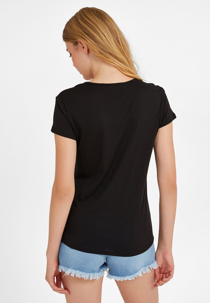 • Bayan Siyah Biye Detaylı Tişört ( MODAL )