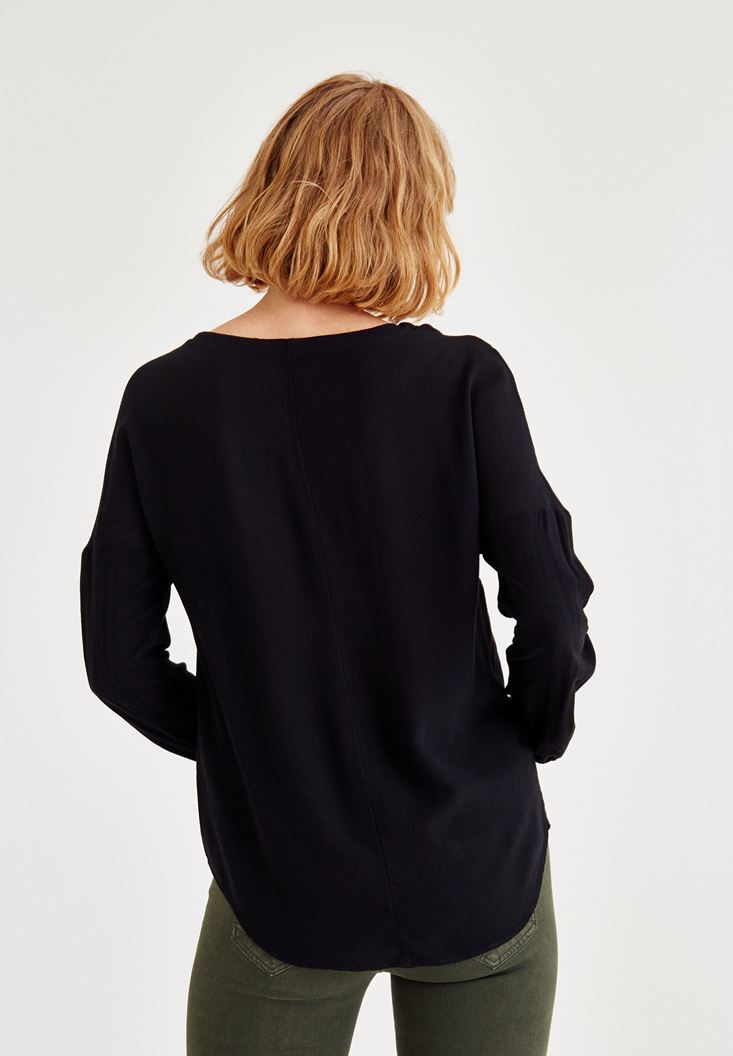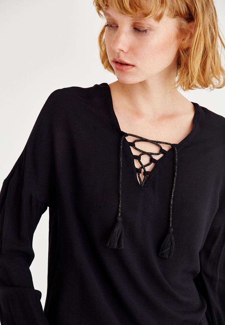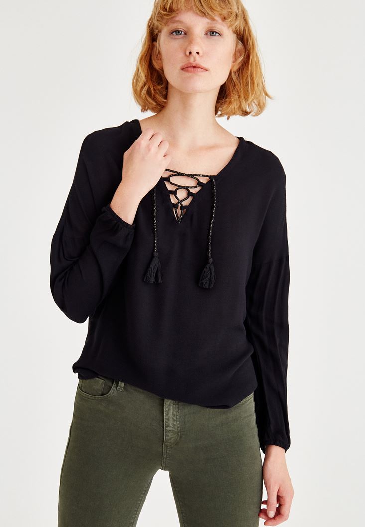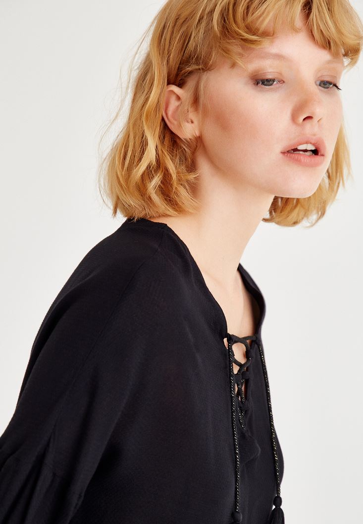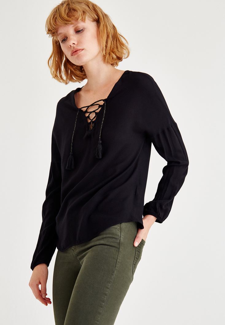 • Bayan Siyah Biye Detaylı Uzun Kollu Bluz