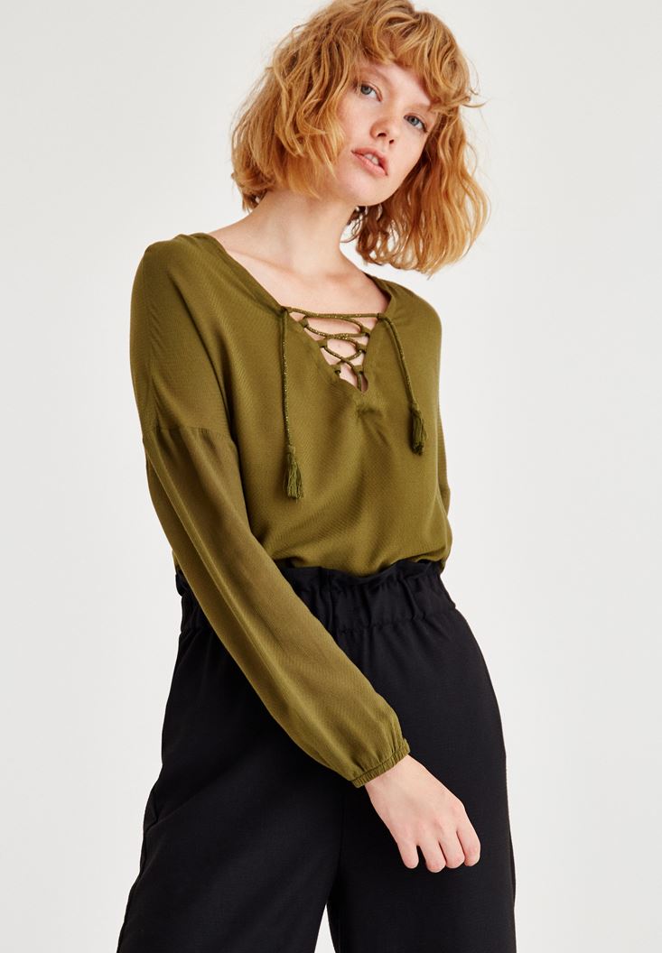 Yeşil Biye Detaylı Uzun Kollu Bluz