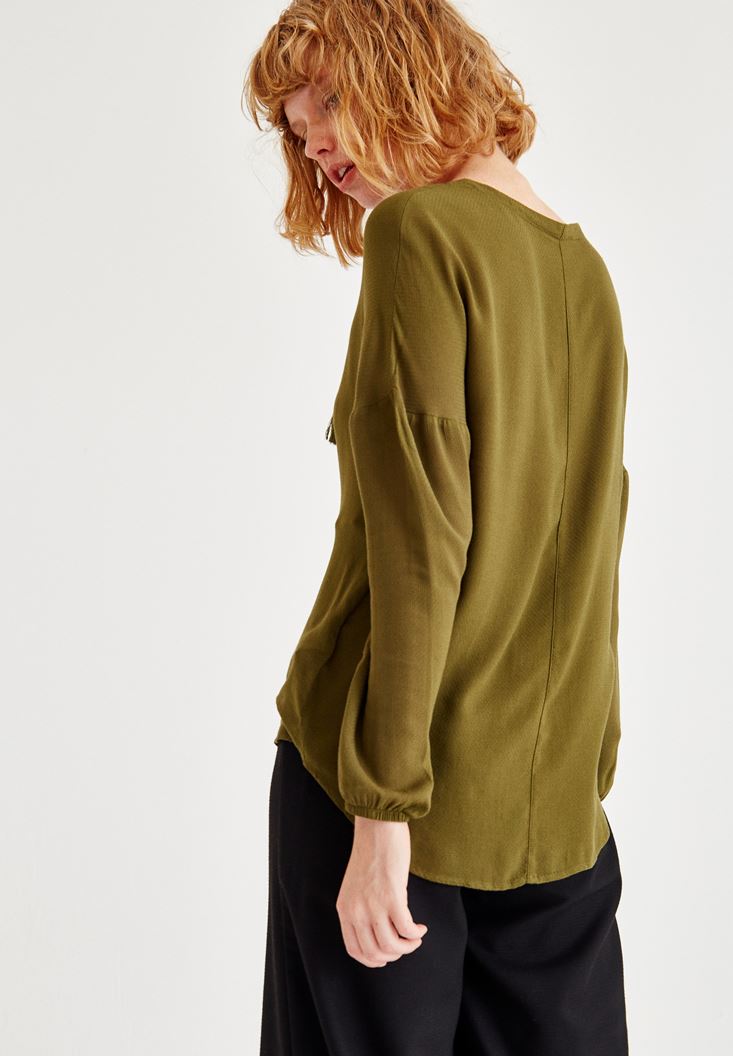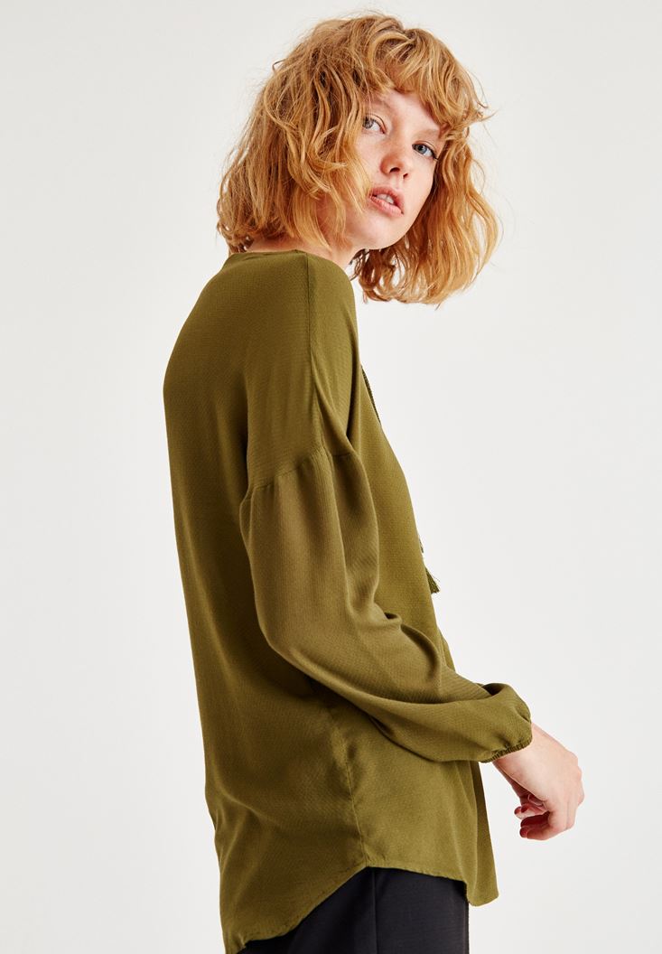 • Bayan Yeşil Biye Detaylı Uzun Kollu Bluz