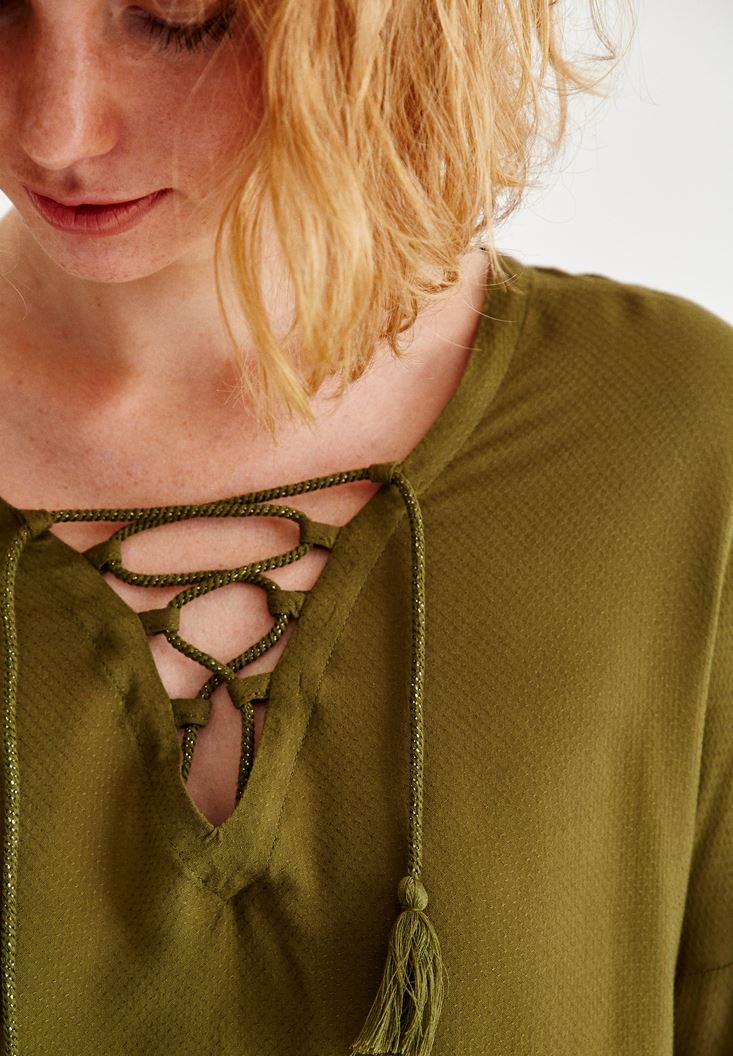 Kombinlerin vazgeçilmez parçalari arasinda yer alan bluz modelleri her zaman istediginiz tarzda hos bir siklik elde etmenizi saglar. Biye detayli uzun kollu bluz modeli rahat kesimi ile günlük siklikta oldukça konforlu bir kullanim sunuyor. V yaka kesimi ve yakada yer alan bagcik detaylari bluz modeline hos bir hareket katiyor. OXXO kumaslarin dokusu ile öne çikardigi konforu tasarimlari ile bir araya getirerek size, hiçbir zaman vazgeçmek istemeyeceginiz konforlu bir siklik deneyimi sunuyor. Kayin agaci özünden elde edilen viskon lifinden üretilen bluz modeli lifin öne çikan özellikleri ile dikkat çekiyor. Viskon lifi uzun süre rengini koruyan, terletmeyen ve yumusak dokusu ile hos bir his veren bir lif oldugu için biye detayli uzun kollu bluz modeli de bu özelliklerin hepsini basarili bir sekilde yansitiyor.
