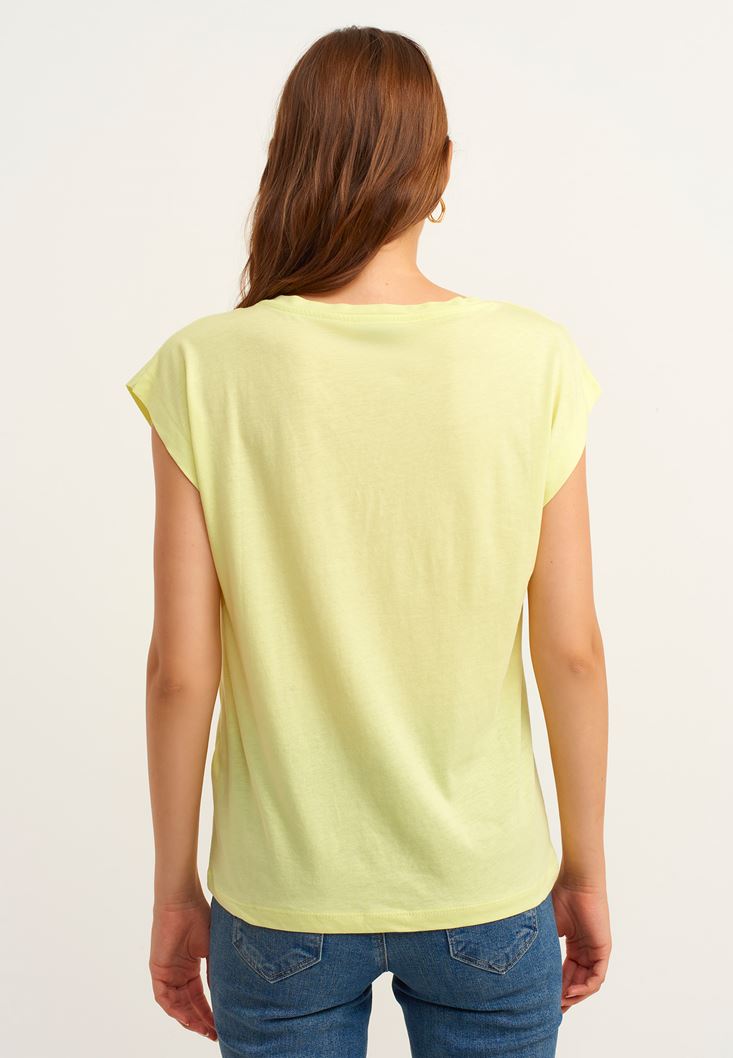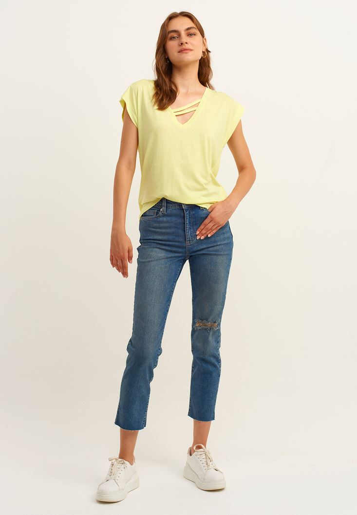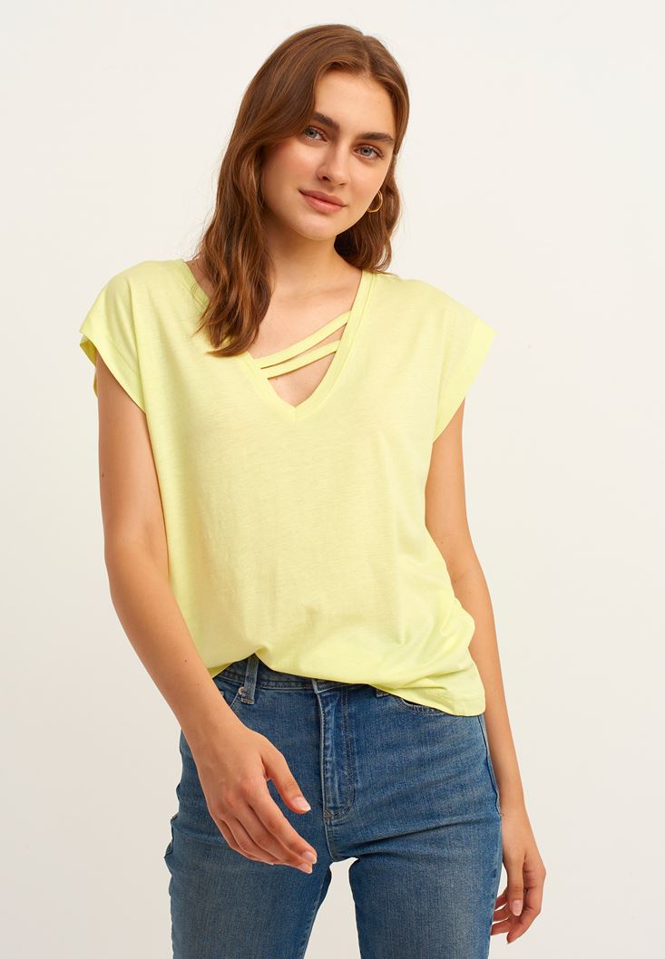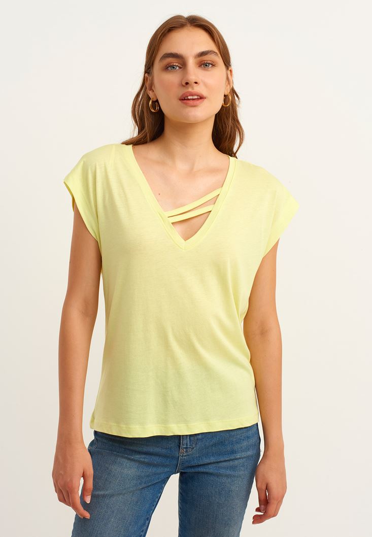 Sarı Biye Detaylı V-Neck Tişört