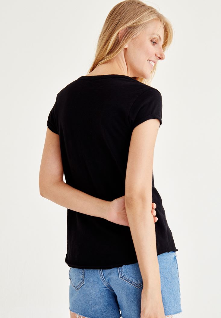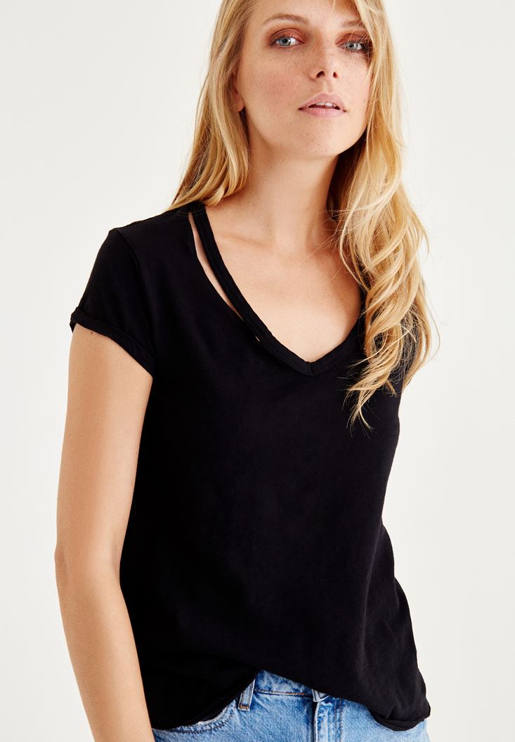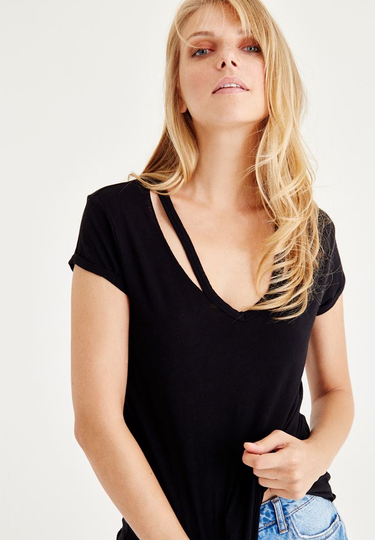 • Bayan Siyah Biye Detaylı V Yaka Tişört