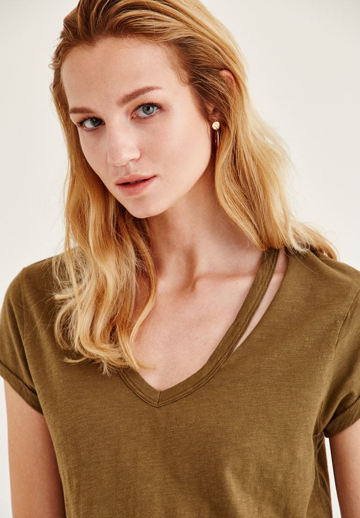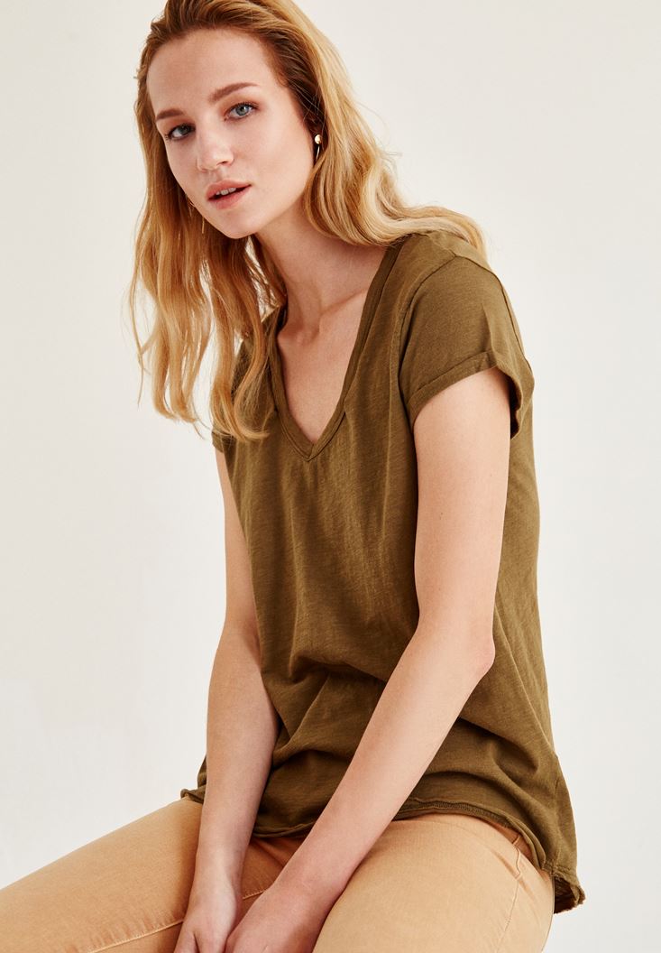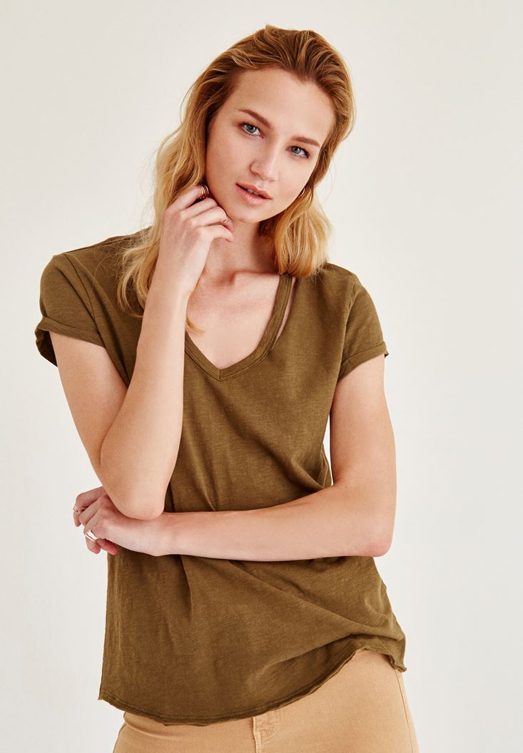 • Bayan Yeşil Biye Detaylı V Yaka Tişört