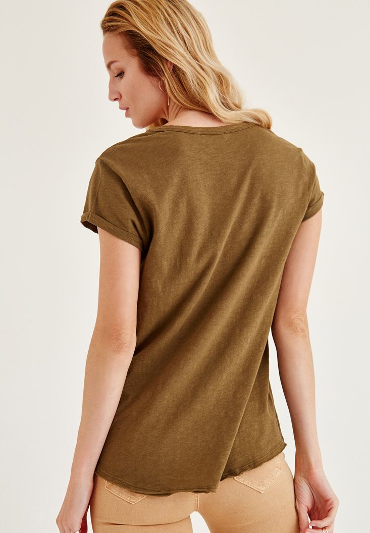 Yeşil Biye Detaylı V Yaka Tişört
