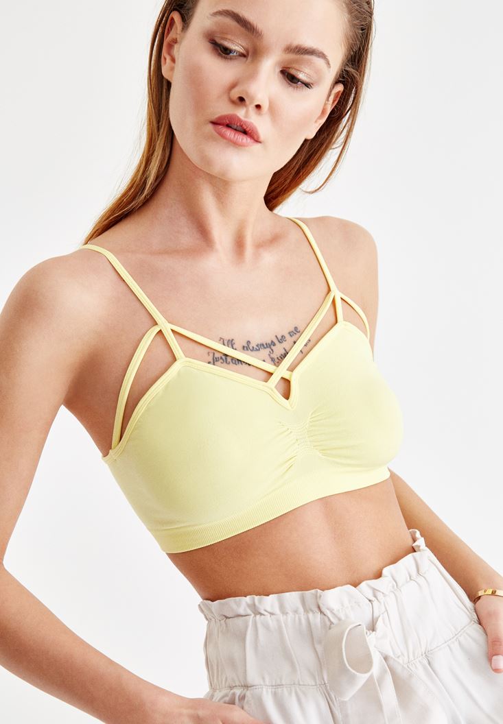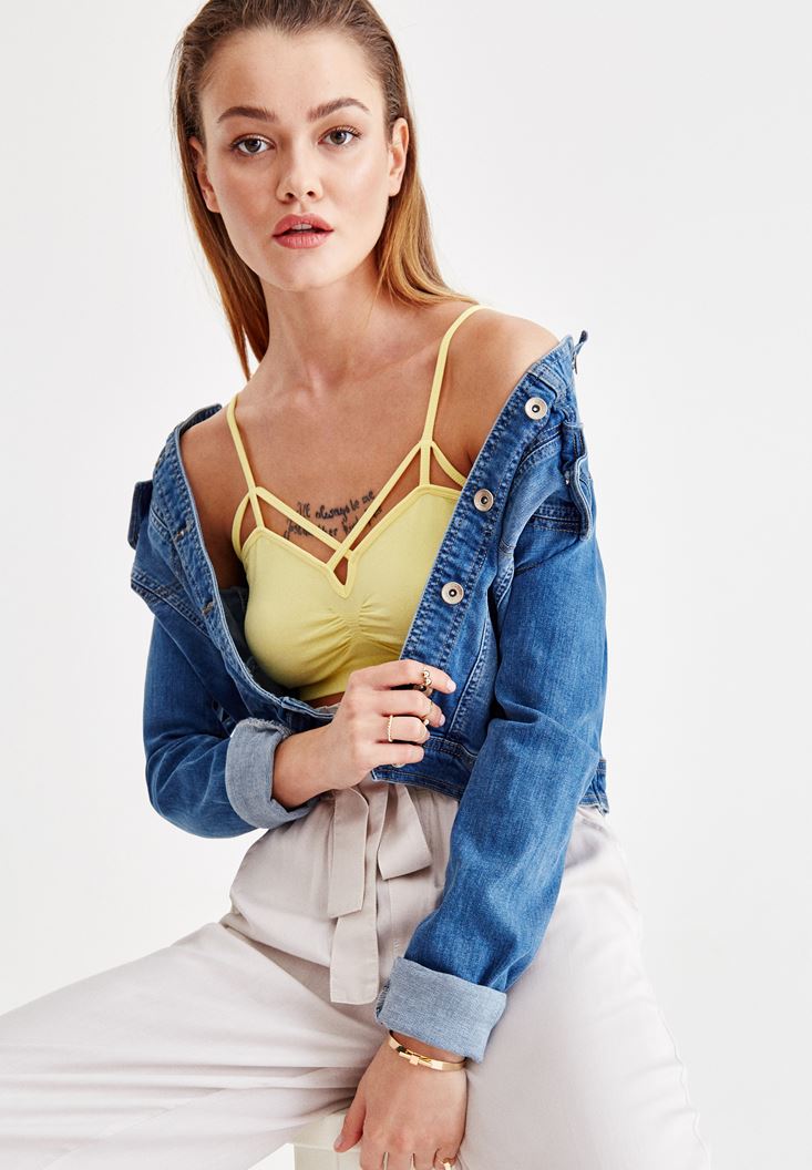 Biyeli Büstiyer; dokusu, detaylari ve sadeligi ile her zaman kombinlerinizde yer vermekten keyif alacaginiz parçalar arasinda yer aliyor. Ince askili tasarimi ile sadeligi ön plana çikaran tasarimin kup kesimini dikkat çekici bir seviyeye tasiyan biye detaylari da tasarima hos bir enerji kazandiriyor. Kup kesimi ile ayni hizada yer alan, ince askilarla birlesen biye detaylar sayesinde dekolteli kiyafetlerinizde hos bir görünüm elde edebilirsiniz. Dünyayi saran bralet akimina kombinlerinizde yer vermenizi saglayan tasarim konforlu yapisi sayesinde hareket özgürlügünüzü de ön plana çikaracak parçalardan birisi. OXXO'nun dikkat çeken parçalara yer verdigi koleksiyonunda yer alan büstiyer modeli konfor ve sikligi bir araya getiren hos bir tasarim.