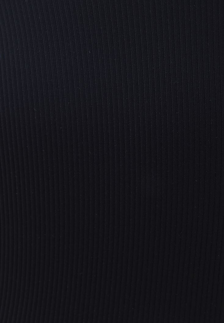 Özel fitilli esnek doku, bedeni saran fit, ince askılı, V yaka, yakası biye detaylı.