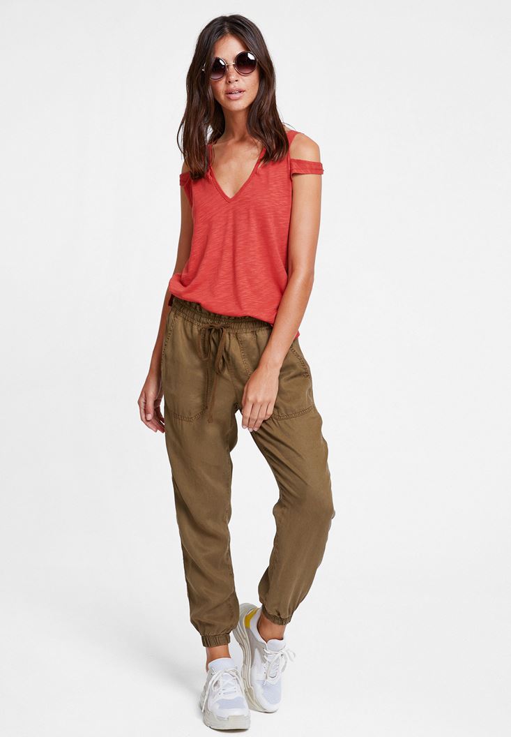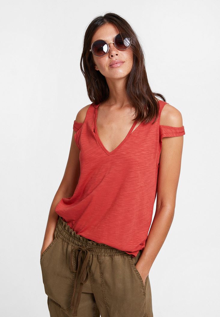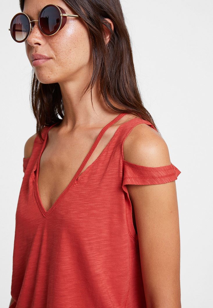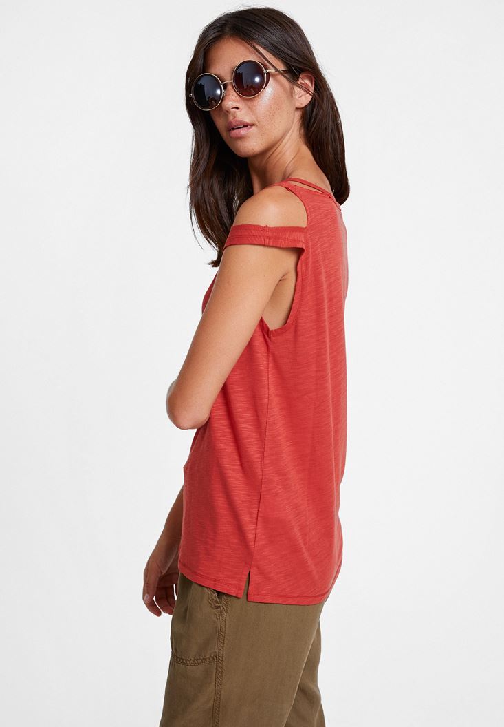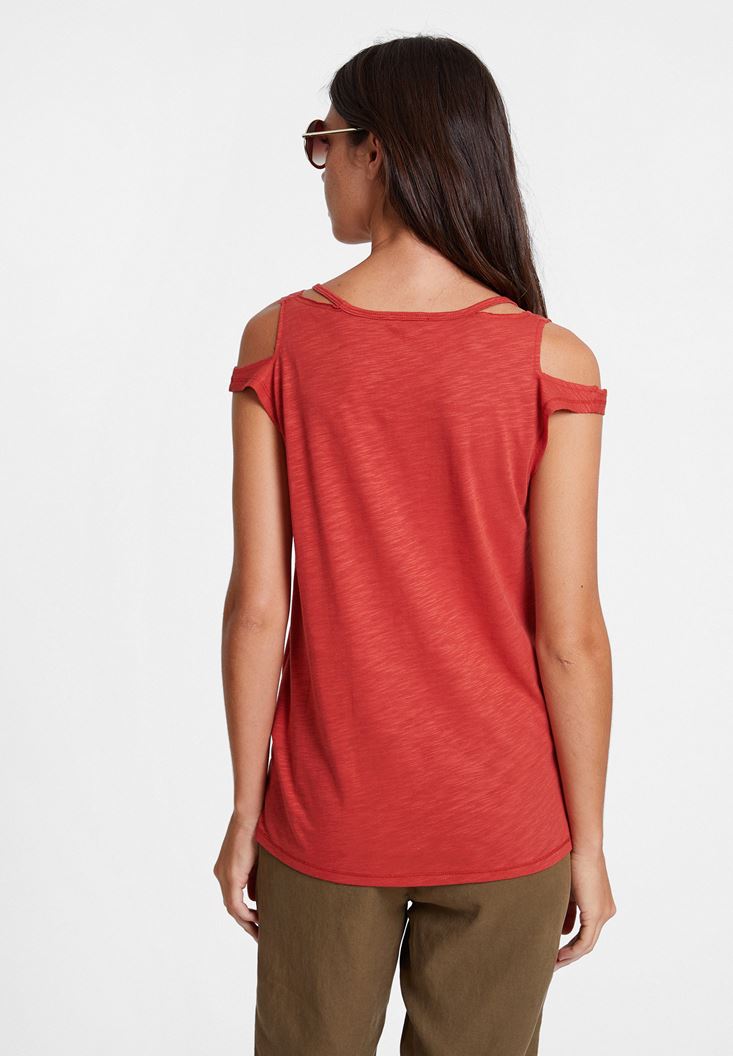 Kırmızı Biyeli Omuz Detaylı Tişört