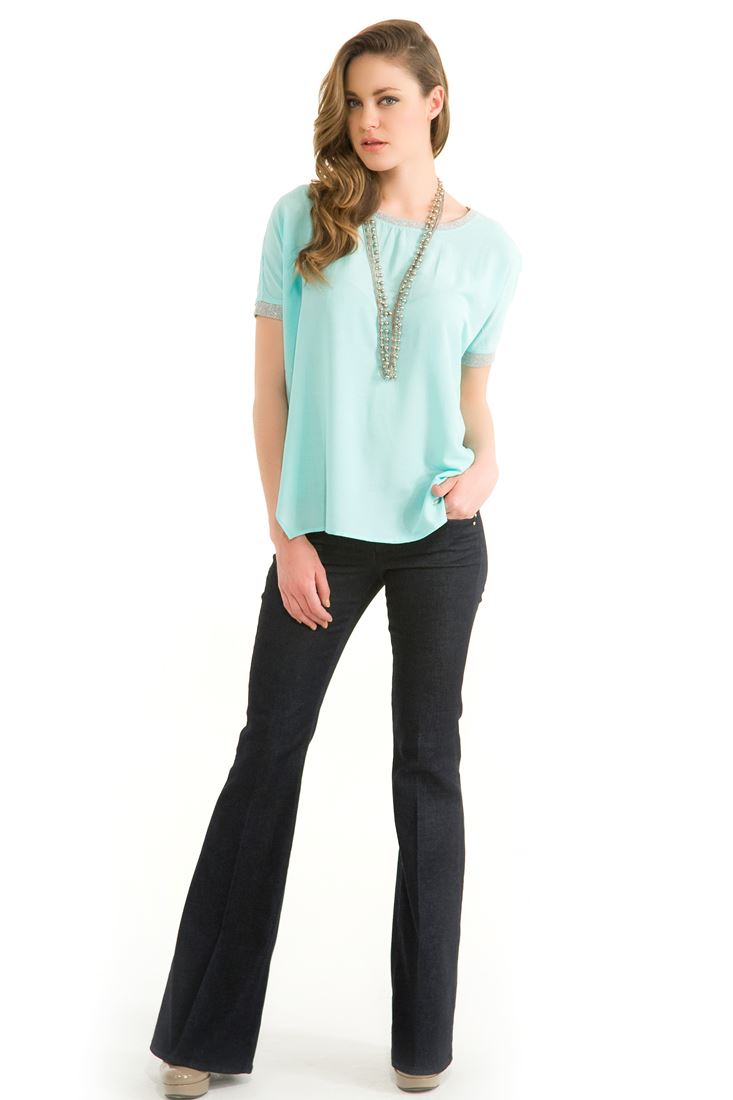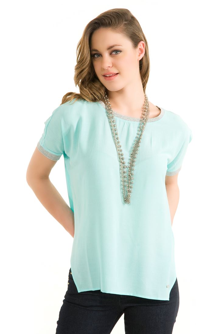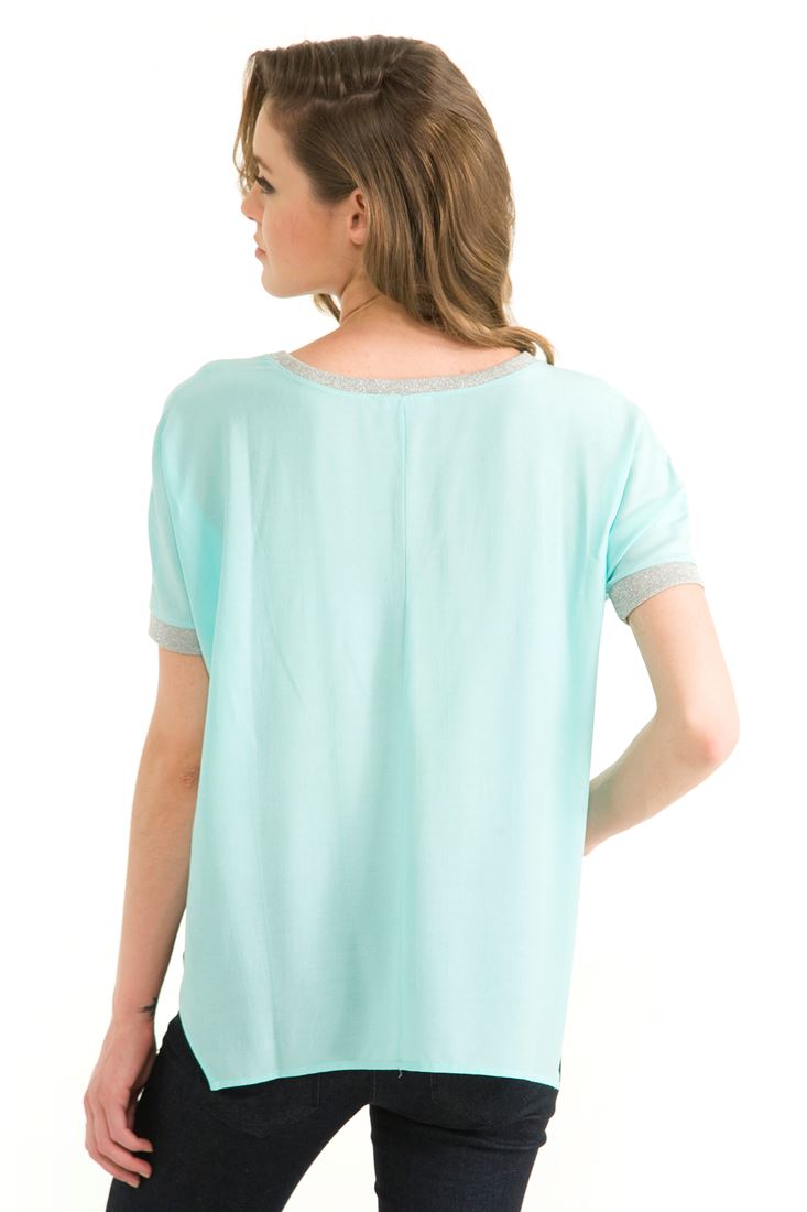 Yaka ve kolları sim detaylı kısa kollu bluz.