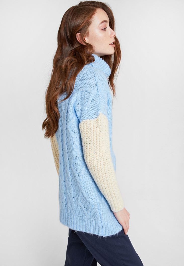 • Bayan Mavi Boğazlı Blok Desen Triko