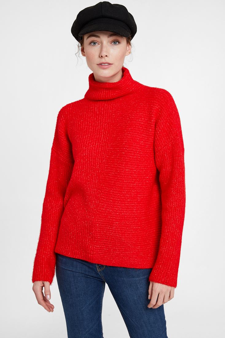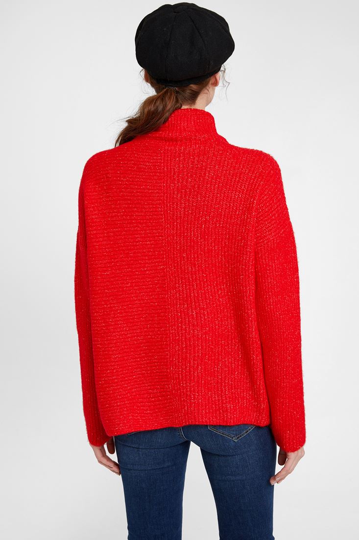 • Bayan Kırmızı Boğazlı Çizgi Dokulu Kazak