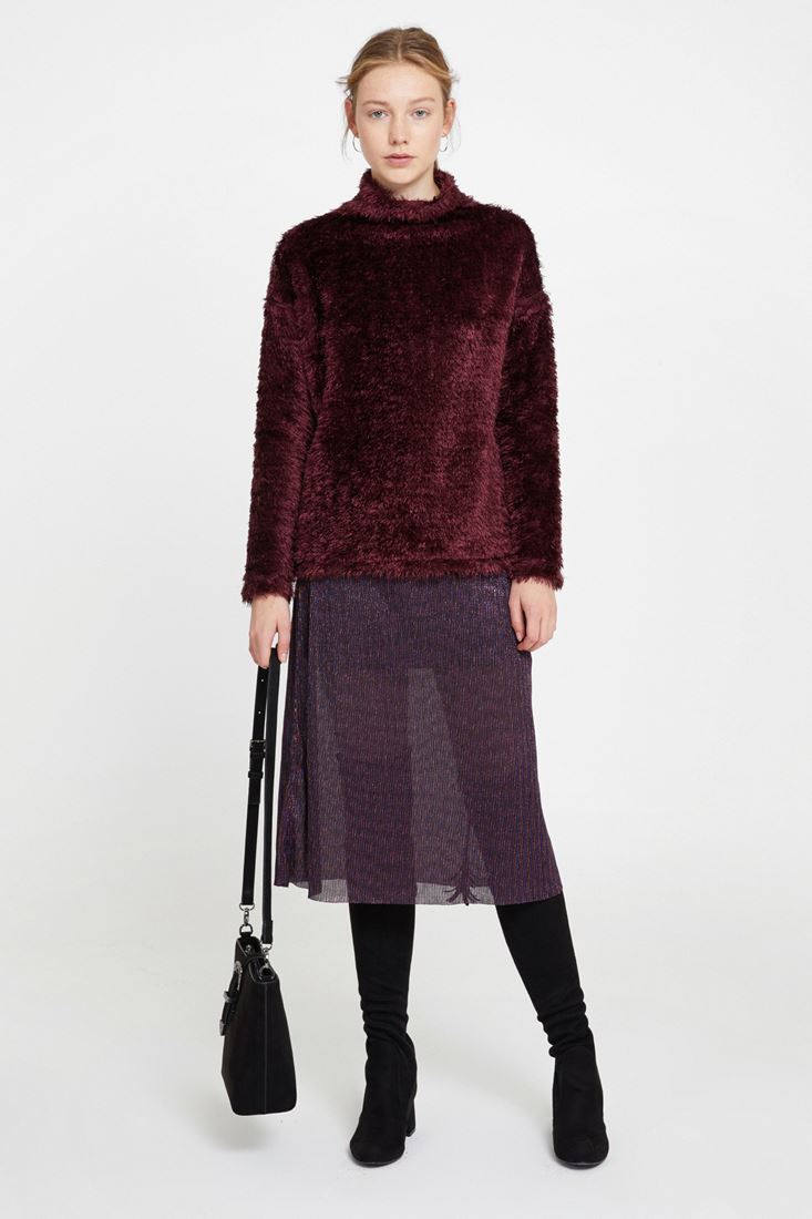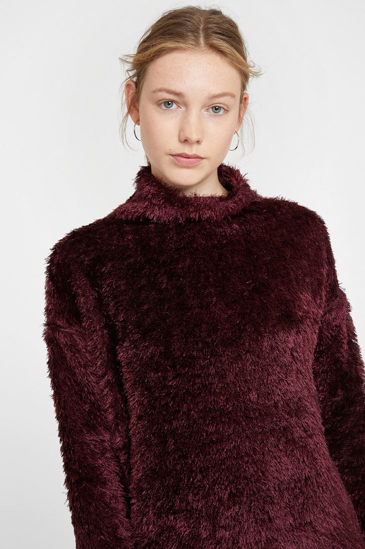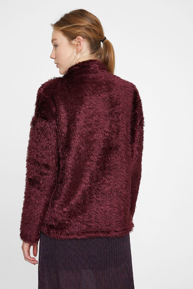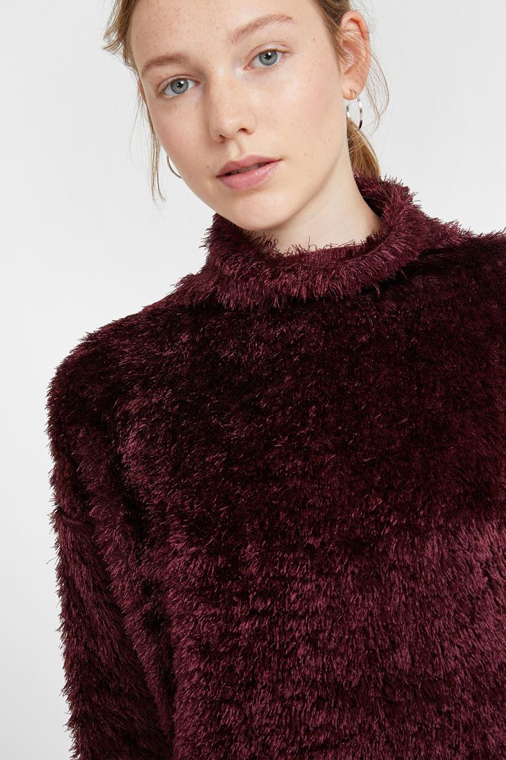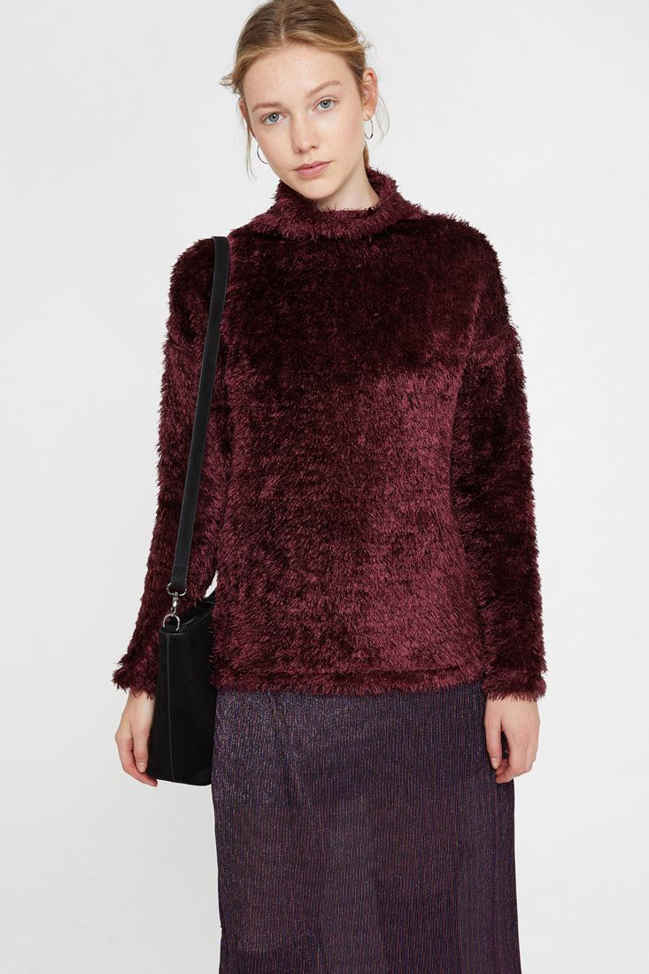 • Bayan Bordo Boğazlı Tüy Detaylı Triko