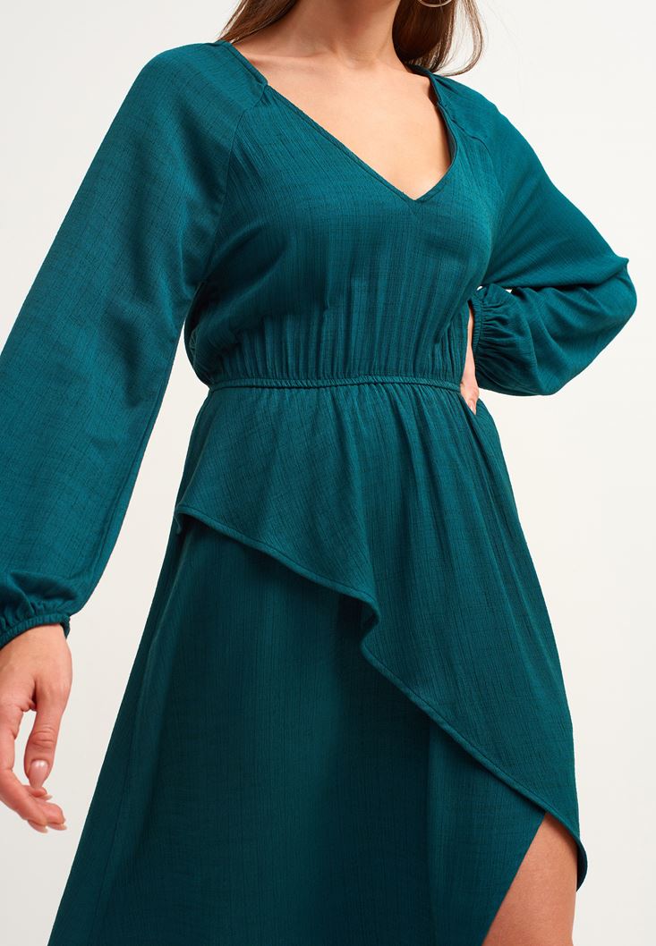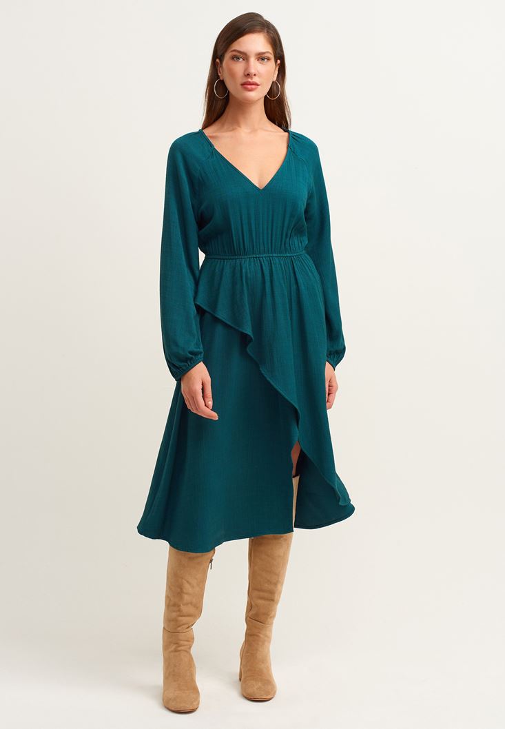 Mevsimin keyfini bohem bir atmosferle buluşturmak bu elbise ile mümkün! Balon kollu elbise modeli, volanlı yırtmaç ayrıntısı ve V yaka kesimi ile çok seveceğin parçalardan biri olabilir... Bohem dokunuşlu kombinlerinde balon kollu elbise modelini kullanırken, uzun çizmelerden ve vegan dokulu ceketlerden yardım alabilirsin! :)