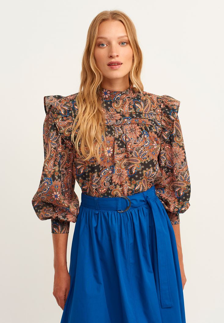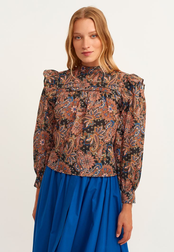 %100 pamuk içerikli özel doku, bohem desenli, yüksek yaka, omzu fırfırlı, standart boy, uzun kollu, göğüs kısmı ve kol ucu büzgülü.
