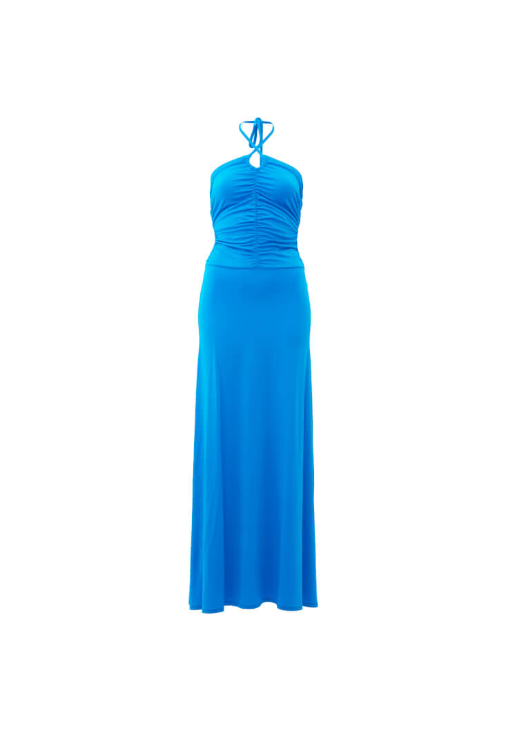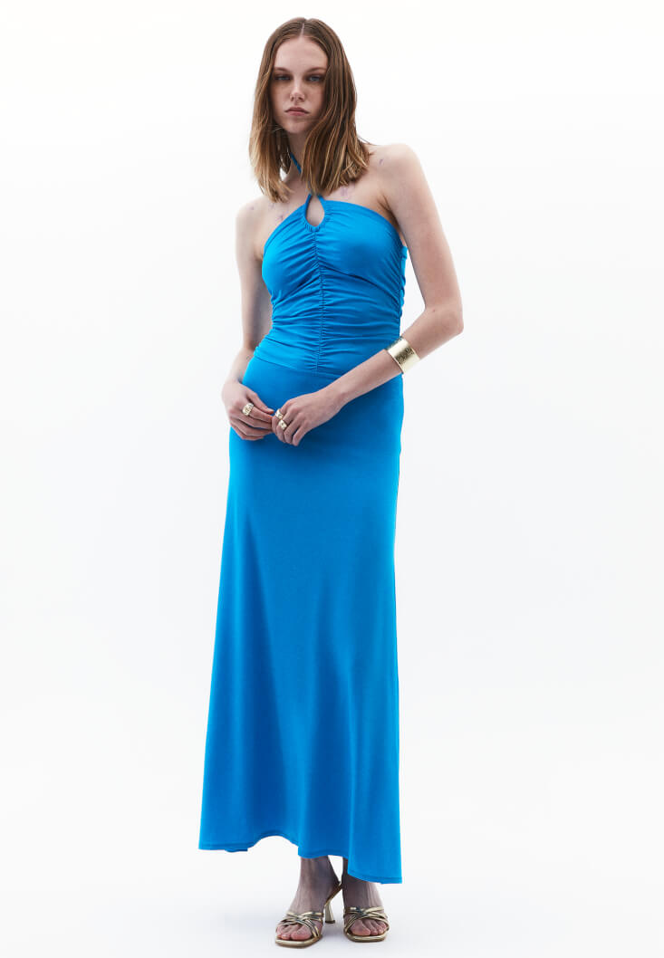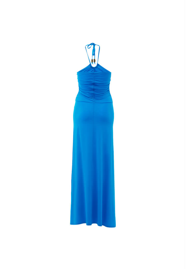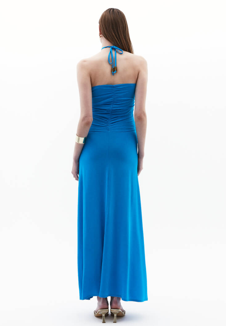 Viskon karışımlı esnek doku, bedene yakın fit, halter yaka, ön kısmı büzgü detaylı, boyundan bağlama detaylı, uzun kesim.