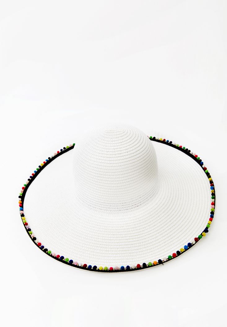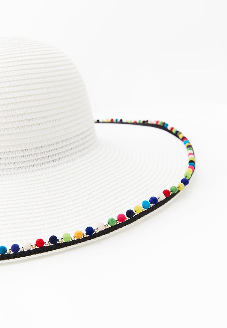 Beyaz Boncuk ve Ponpon Detaylı Hasır Şapka