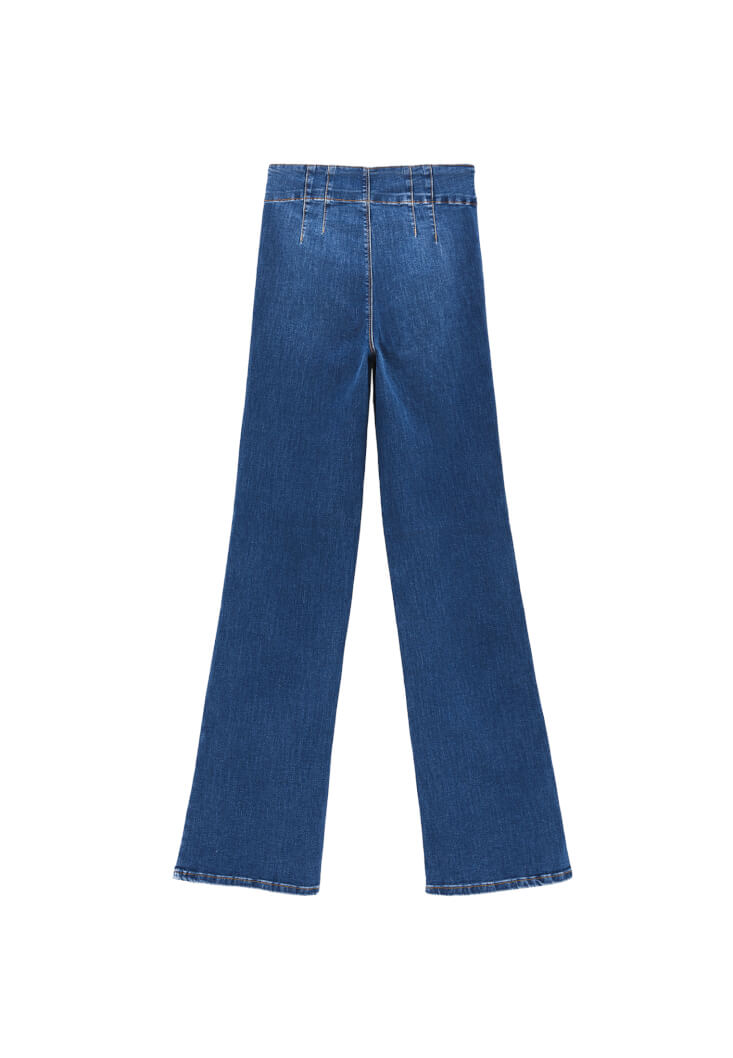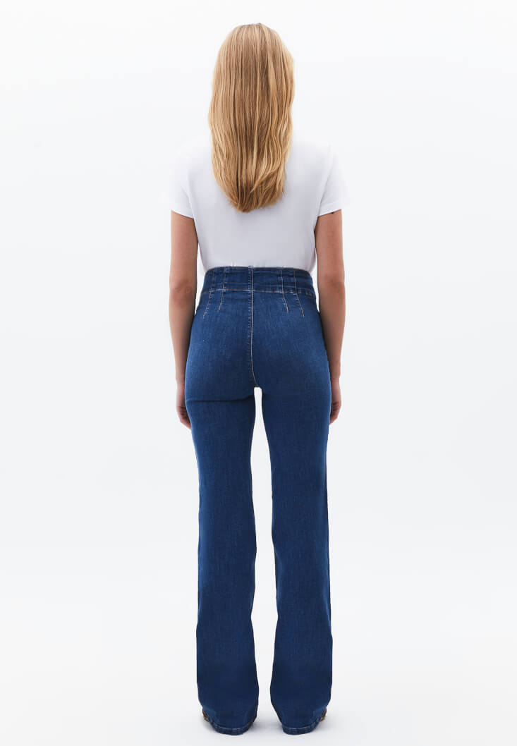Pamuk karışımlı denim kumaşıyla hem rahat hem de dayanıklı bir kullanım sunan bu pantolon, ultra yüksek bel tasarımıyla belinizi vurgularken bootcut kesimiyle dengeli ve modern bir silüet oluşturur. Mavi tonuyla gardırobunuzda zamansız bir parça olmaya adaydır.