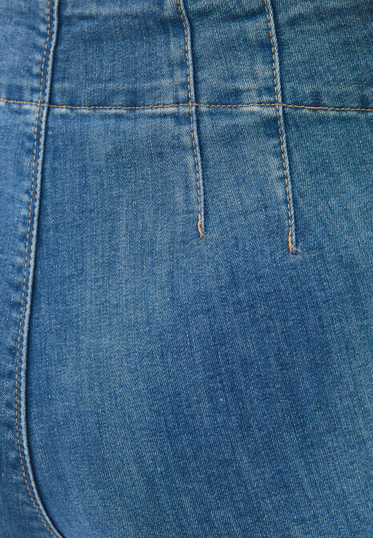 Pamuk karışımlı denim, ultra yüksek bel, bedene yakın fit, bootcut paça, yıkamalı görünüm.
