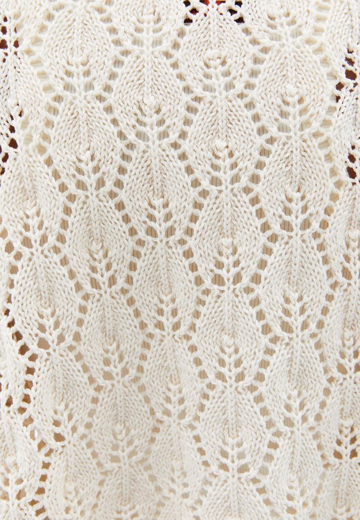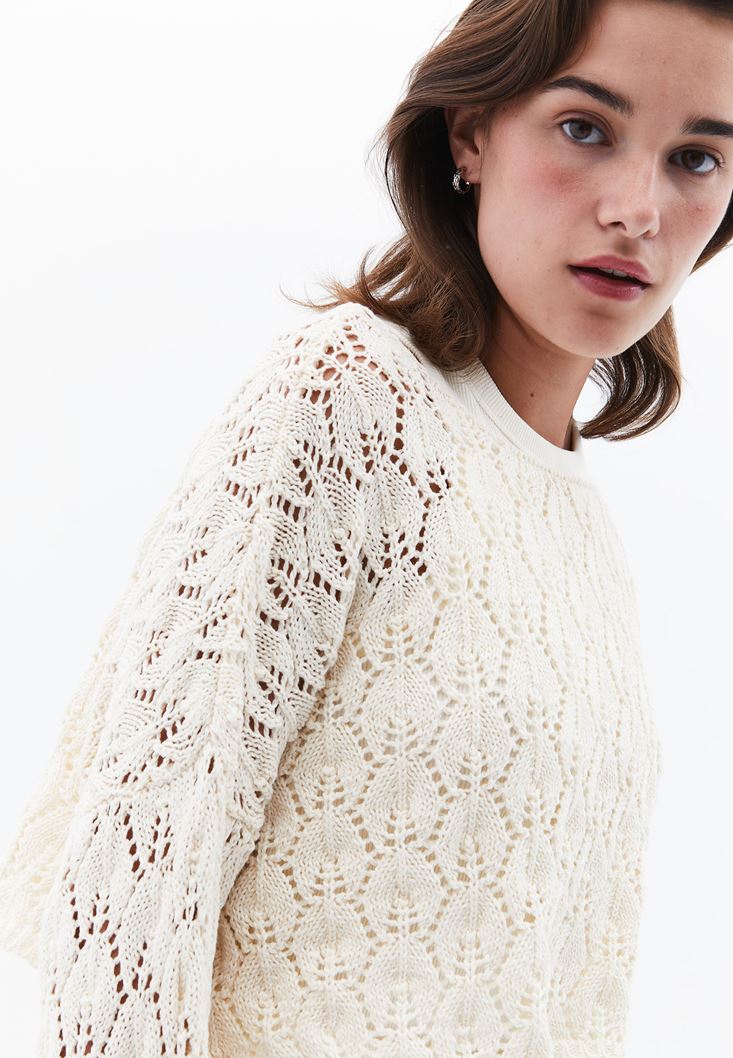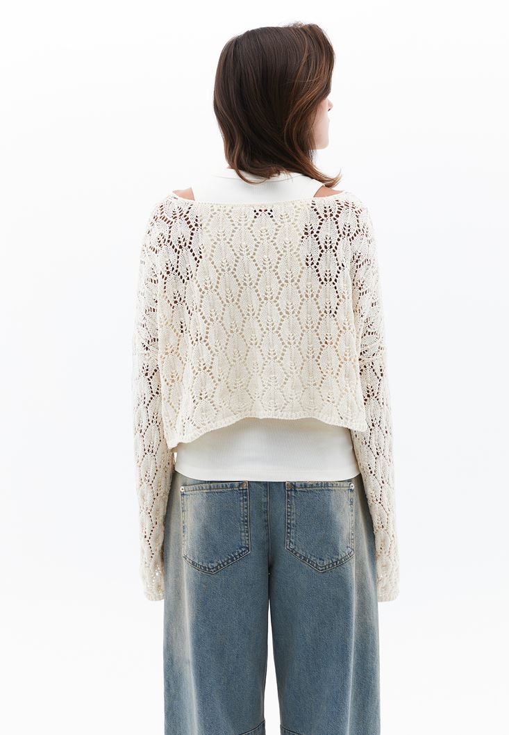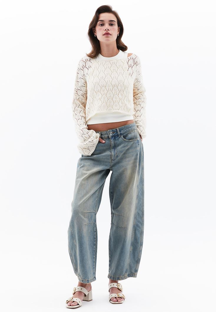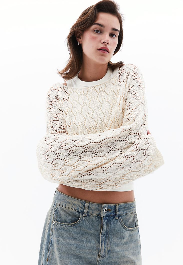 Pamuk karışımlı içerik, ajurlu örgü triko, bot yaka, crop kesim, geniş kol kesimli, uzun kollu, bedenden uzak relax fit.
