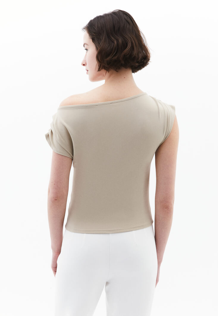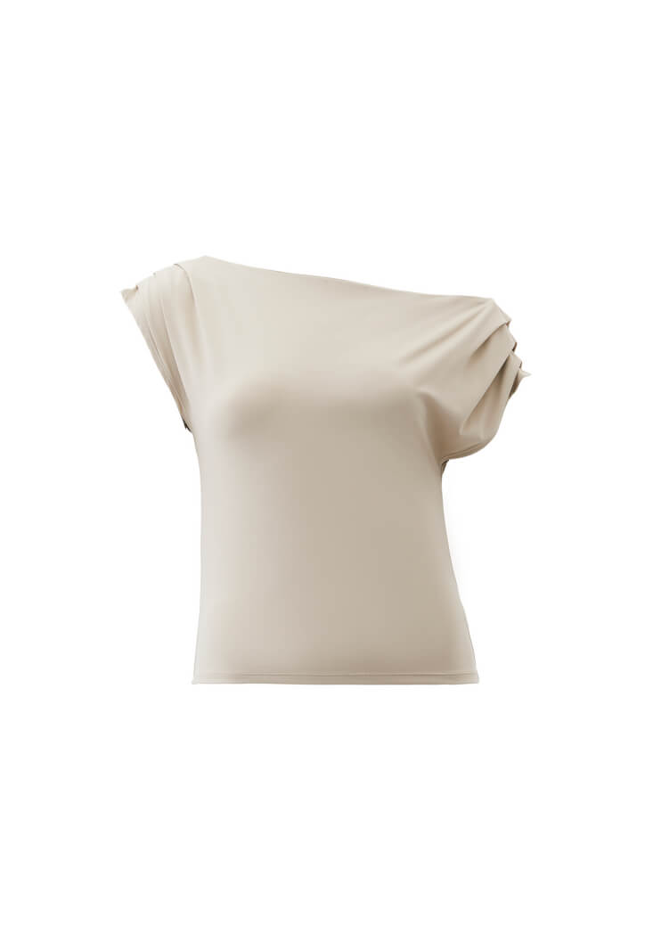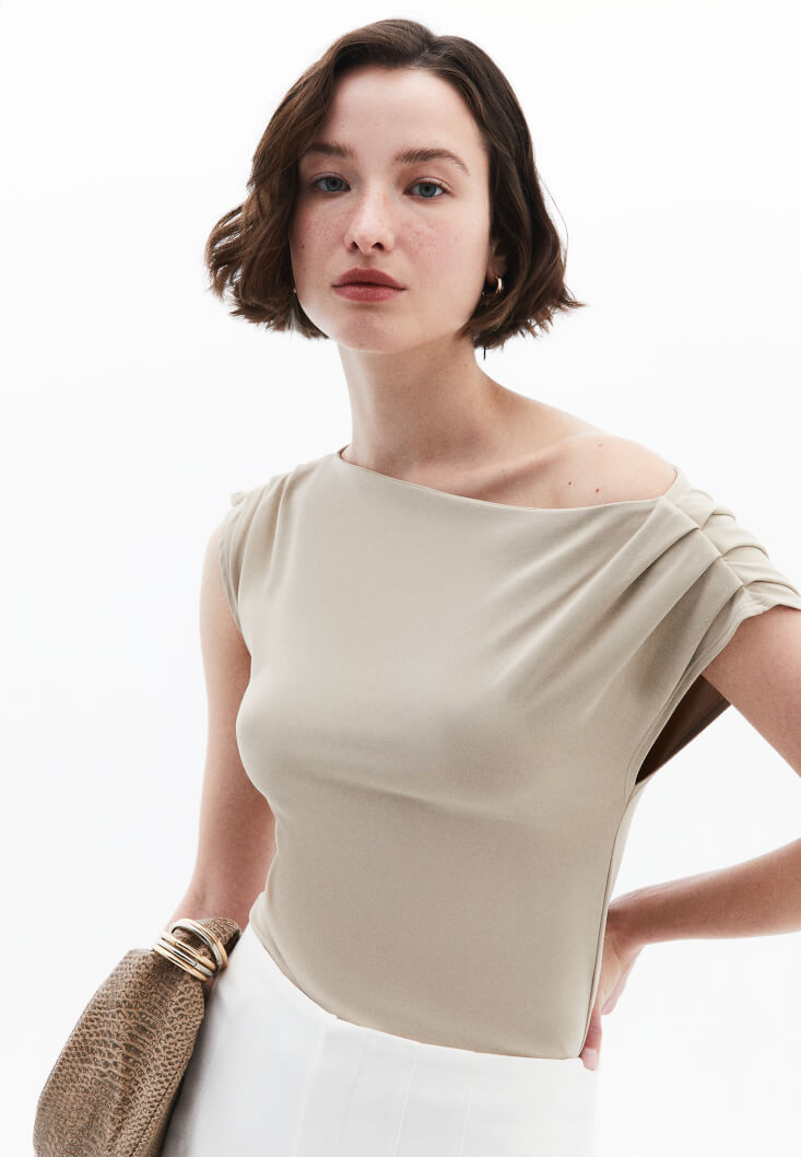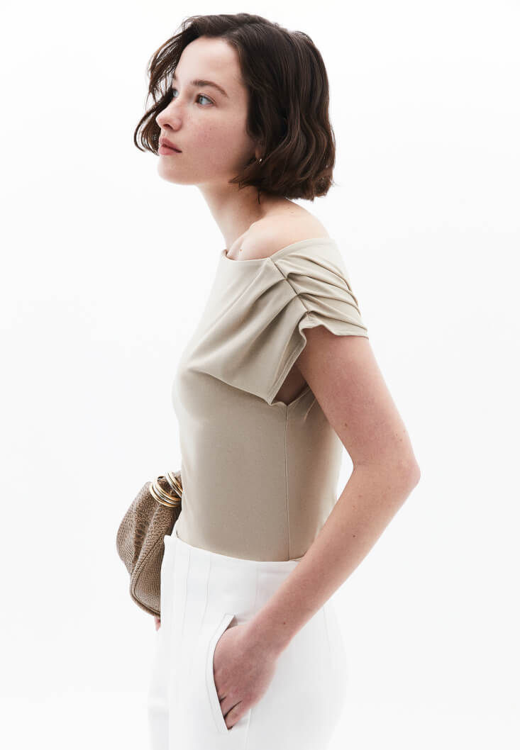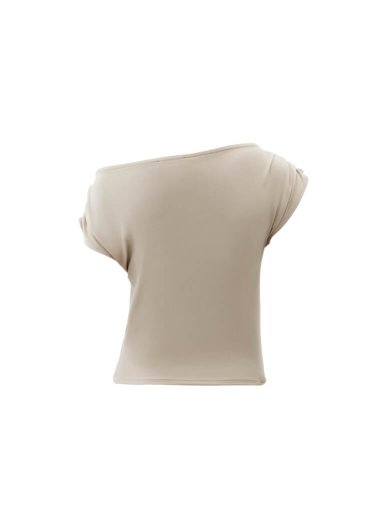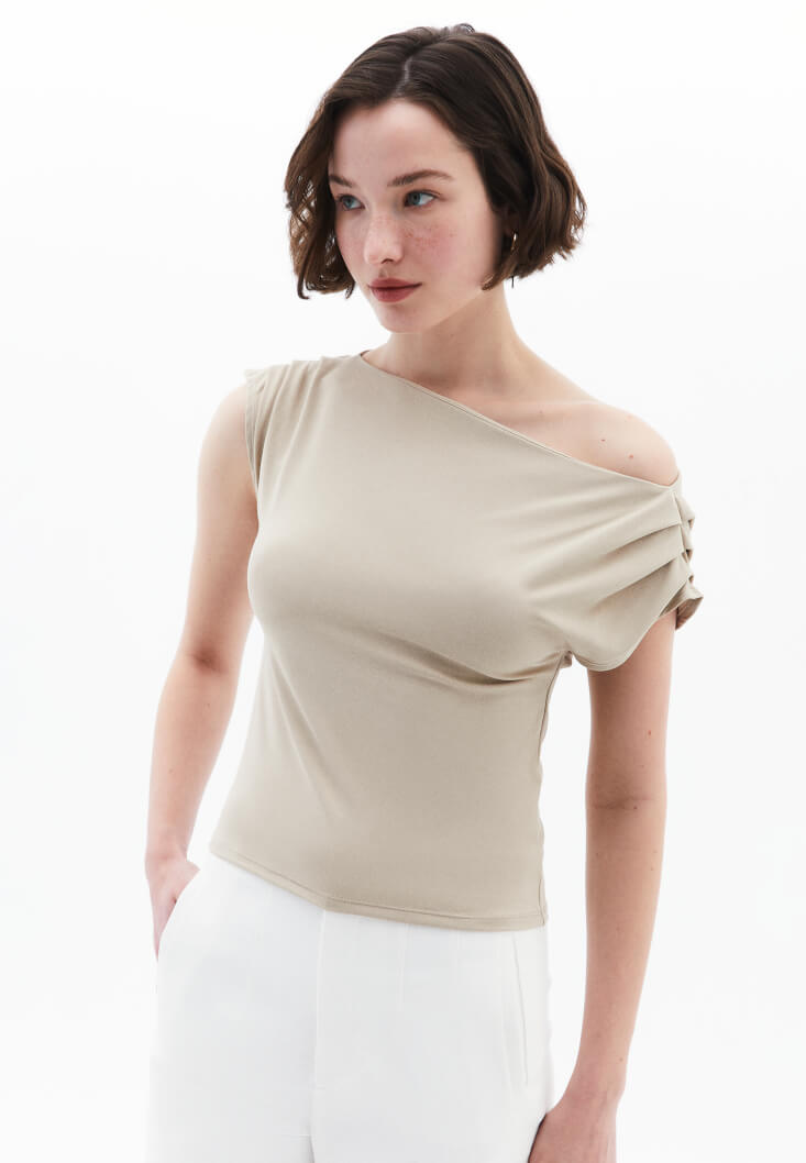 Bedene yakın esnek fit, bot yaka, tek omzu düşük ve büzgü detaylı, kısa kollu.