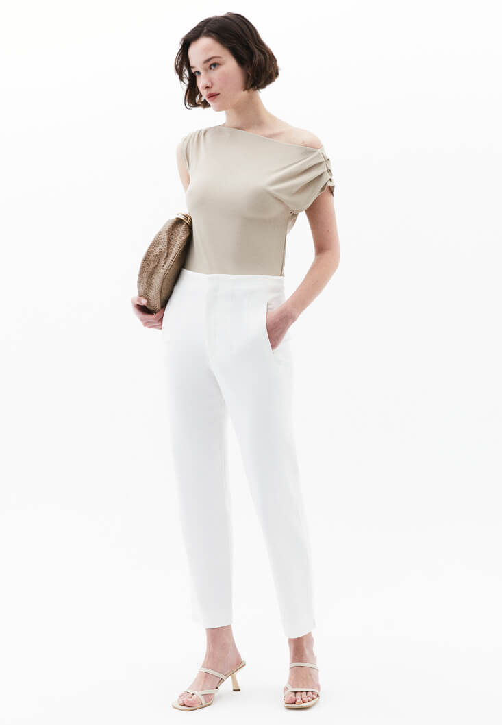 Bu yapısal ve akışkan tasarımı, alt grupta dengeleyici bir güç sunan ultra yüksek bel straight-fit pantolonlar veya dökümlü keten wide-leg tasarımlarla eşleştirerek formlar arası iddialı bir diyalog kurabilirsiniz. Görünümünüze modern bir vurgu eklemek isterseniz, üzerine alacağınız oversize bir blazer ceket veya kemer detaylı bir trençkotla maskülen-feminen bir harmoni yakalayın. Hem yoğun ofis temposunda hem de akşamüstü gerçekleşen şık buluşmalarda yanınızdan ayırmak istemeyeceğiniz bu parça, OXXO kadınının özgür ve doğal ruhunu temsil ediyor.