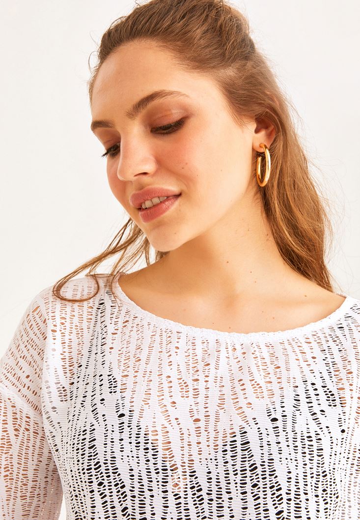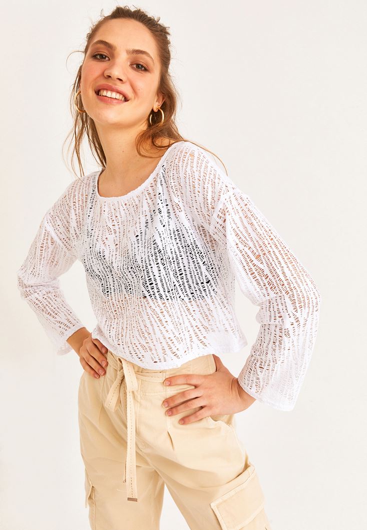 • Bayan Beyaz Bot Yaka Dantelli Bluz