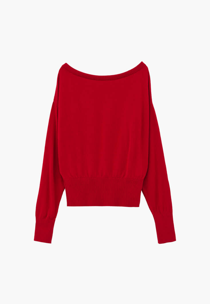 Viskon karışımlı triko, bedenden uzak loose fit, bot yaka, uzun kollu, kol ucu ve beli jakarlı örgü.