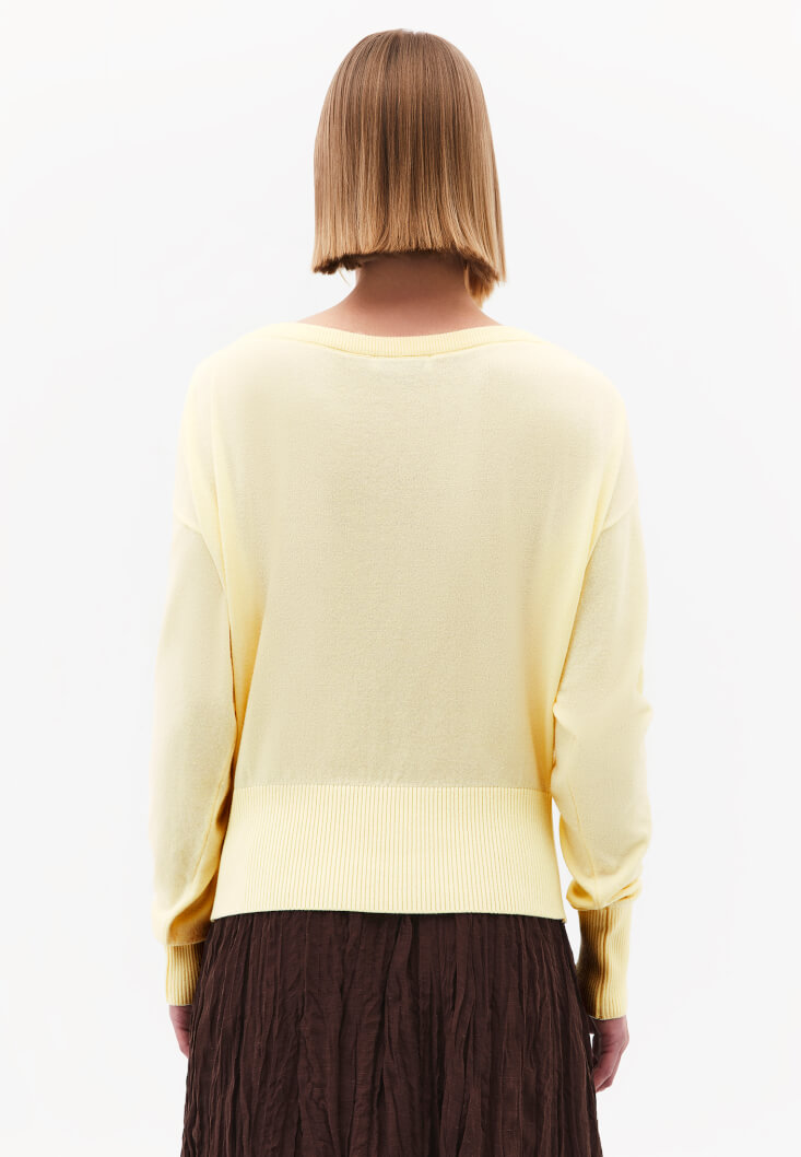 Viskon karışımlı triko, bedenden uzak loose fit, bot yaka, uzun kollu, kol ucu ve beli jakarlı örgü.